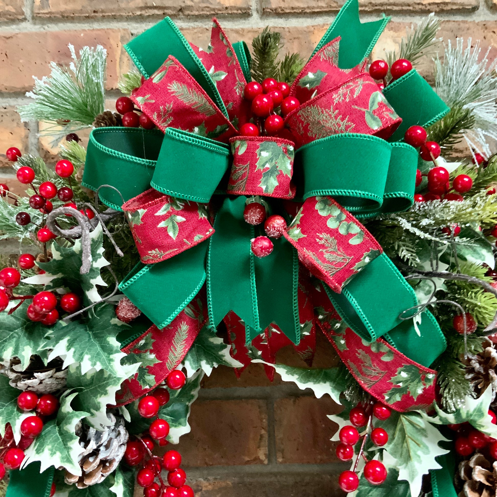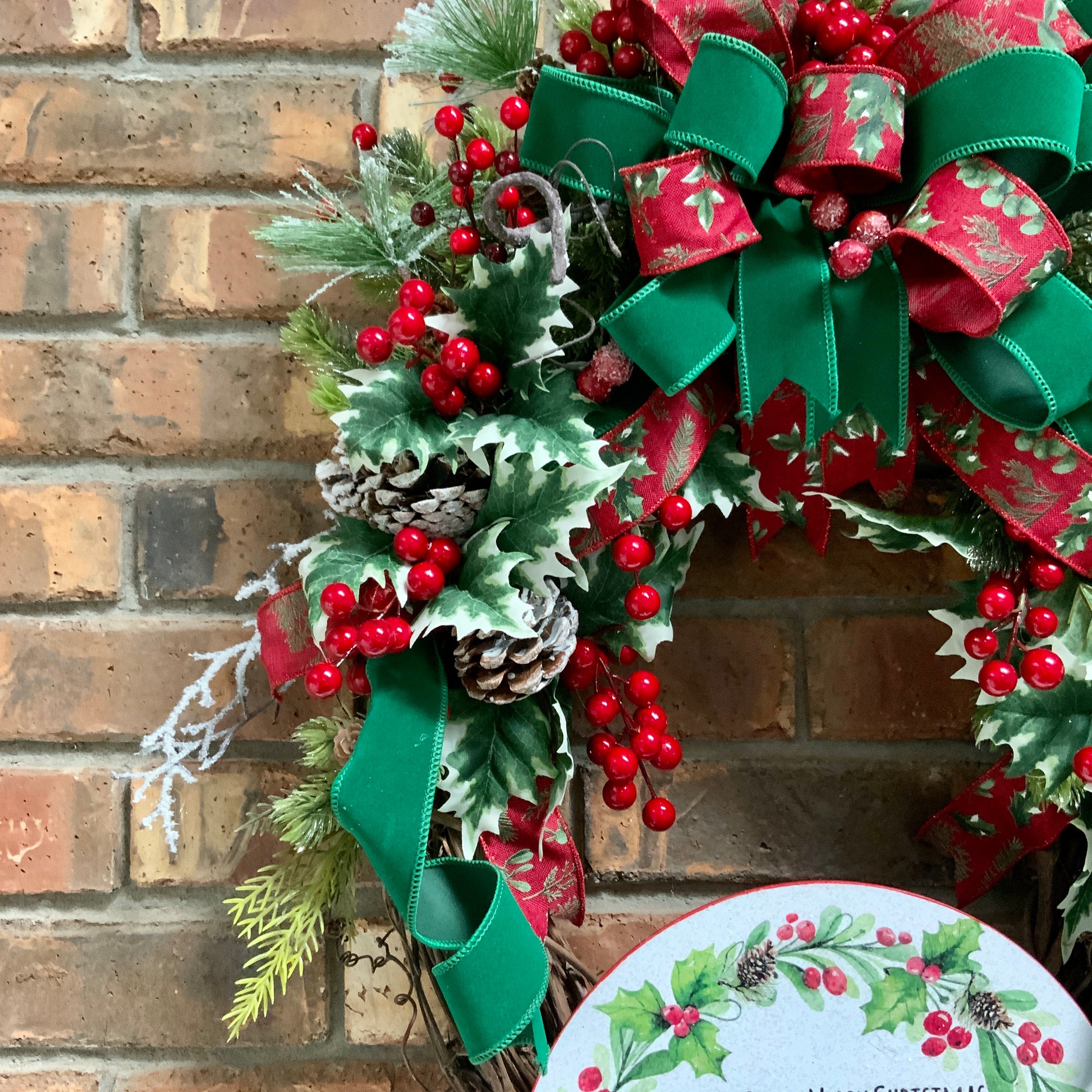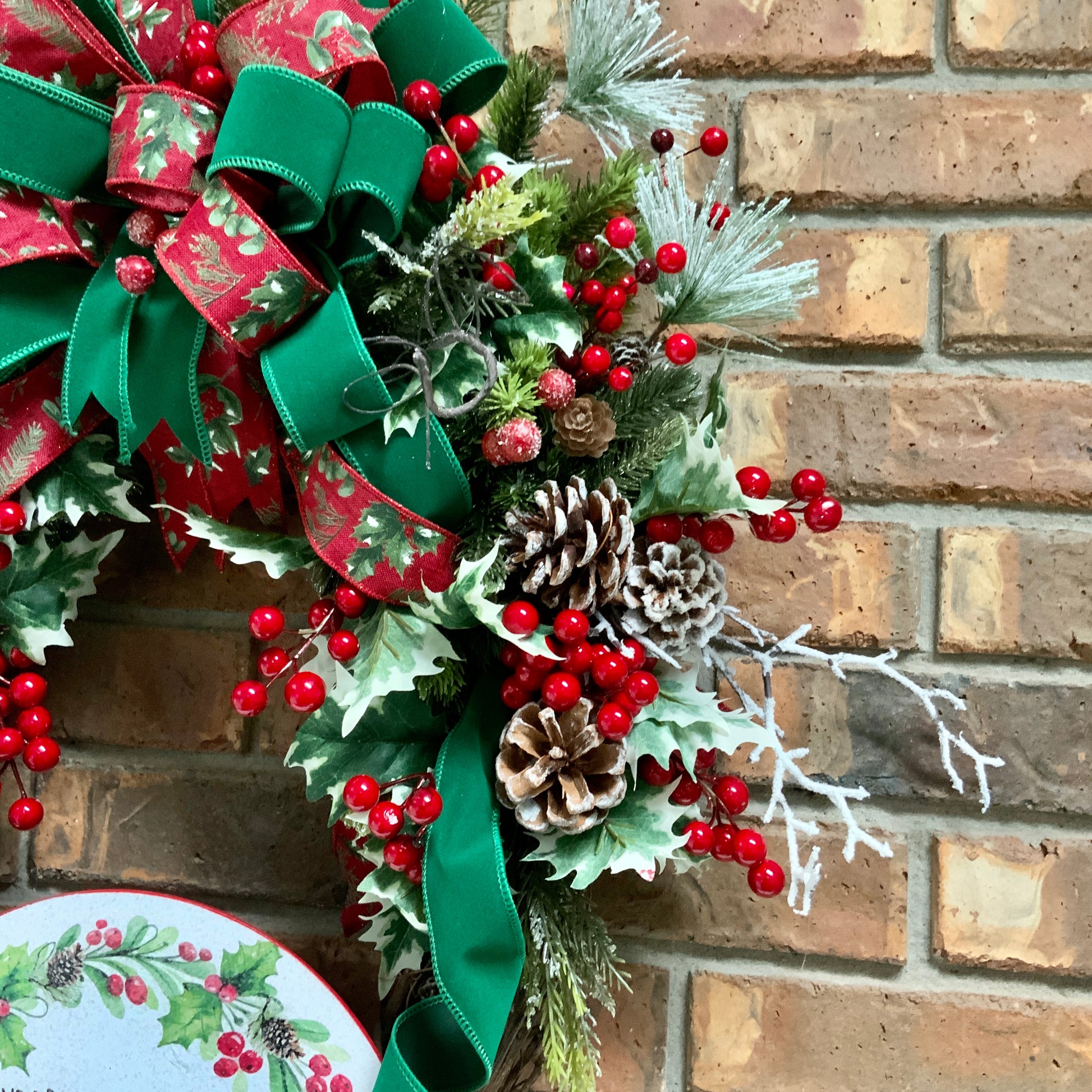Measuring in at 25 inches in height, 24 inches in width and 7 inches in depth. This wreath is made on an oval grapevine with a wooden sign, wired edge ribbons, red berries, pine cones, faux greenery and a handmade bow.