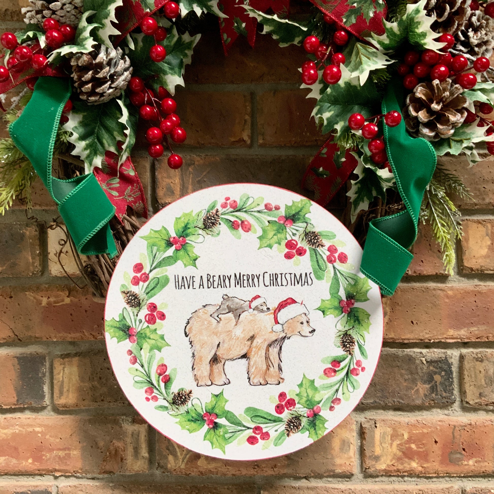 Wishing you a Beary Merry Christmas is an adorable and outdoors themed holiday wreath. Combining traditional colors, layered textures and a whimsical sign this wreath ready to welcome and delight your holiday guests. Makes a wonderful holiday gift.