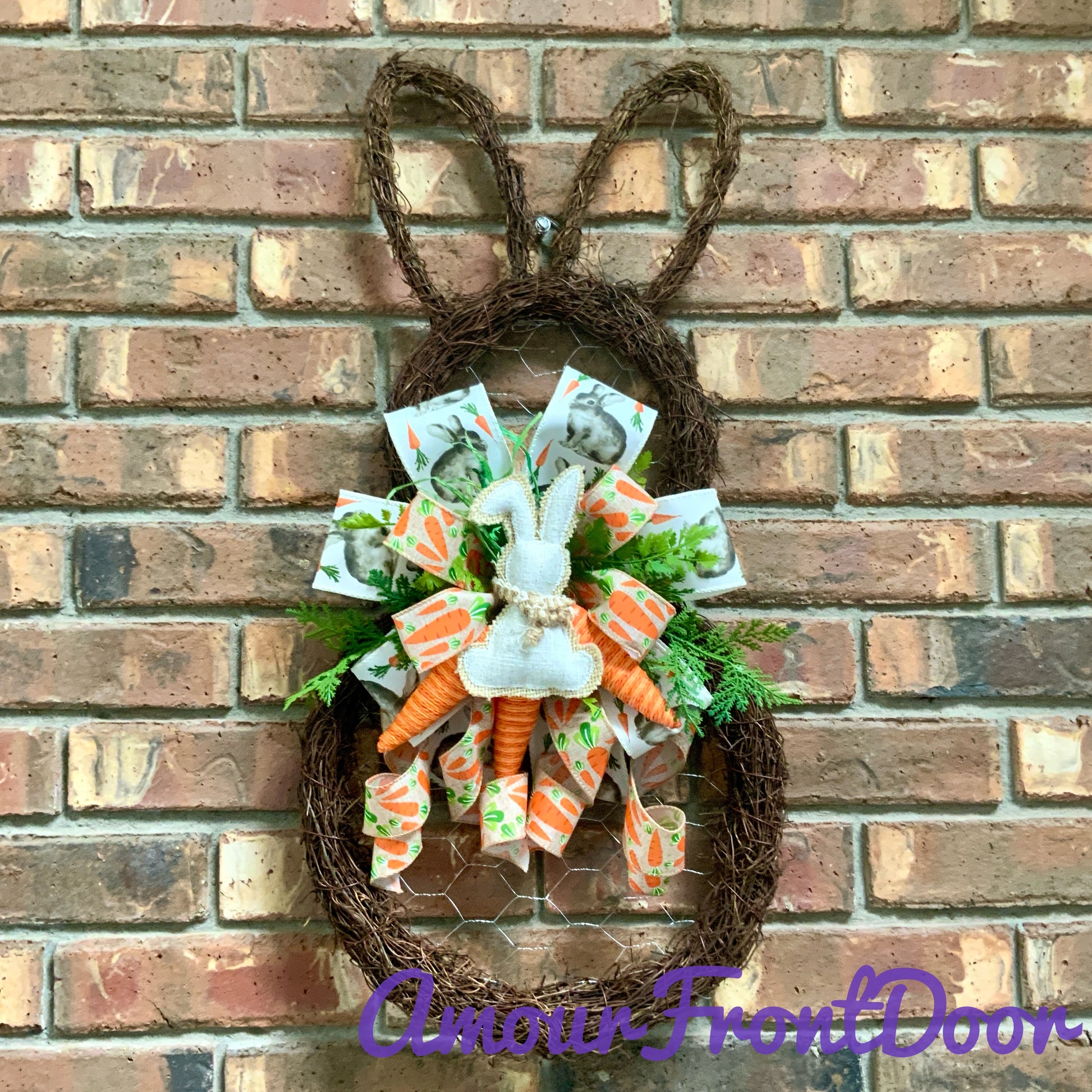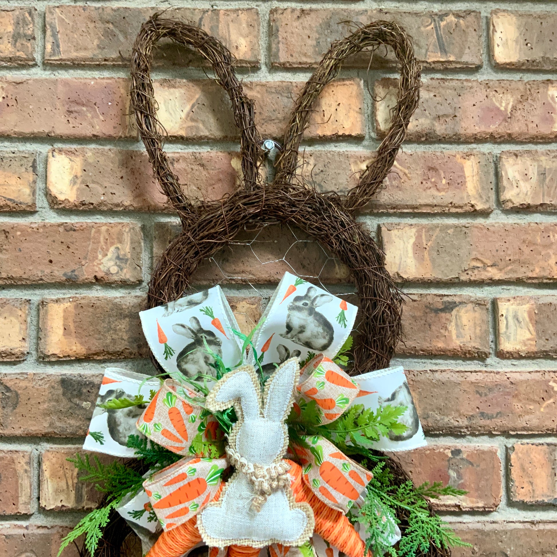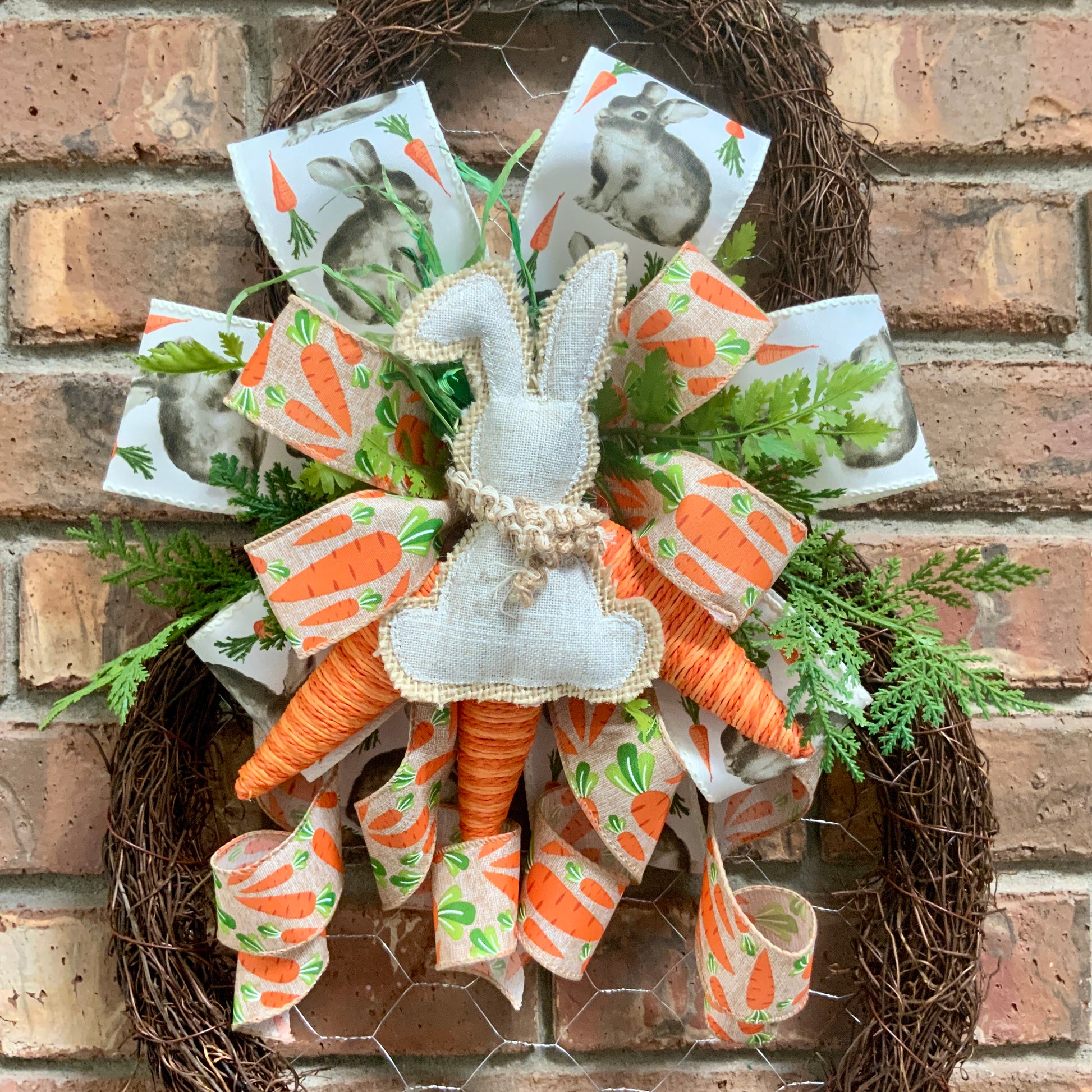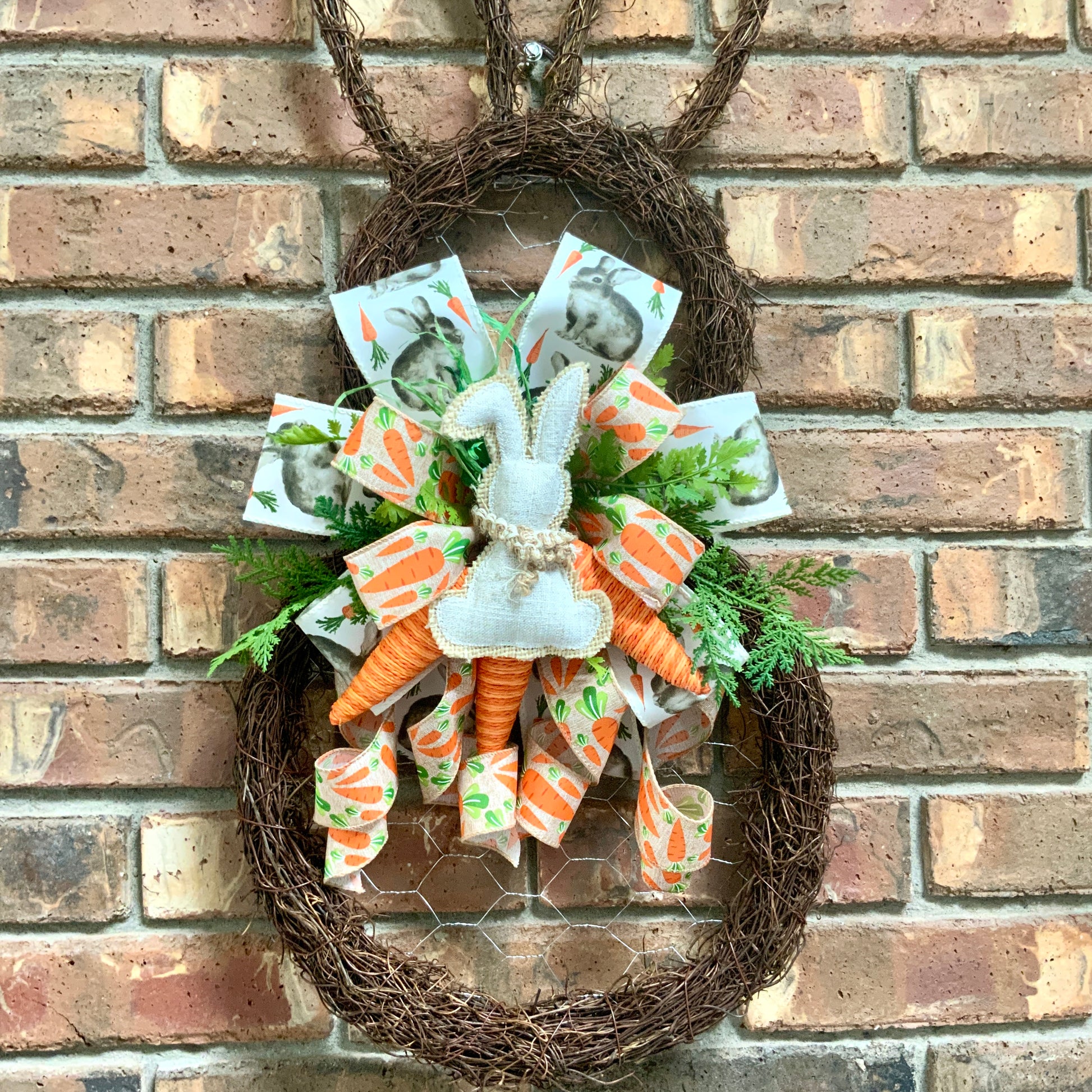 Measuring in at 26 inches in height, 12 inches in width and 5 inches in depth. This door hanger is made on an angel vine wreath base with chicken wire, wired edge ribbons, faux greenery, yarn carrots and a handmade bow.
