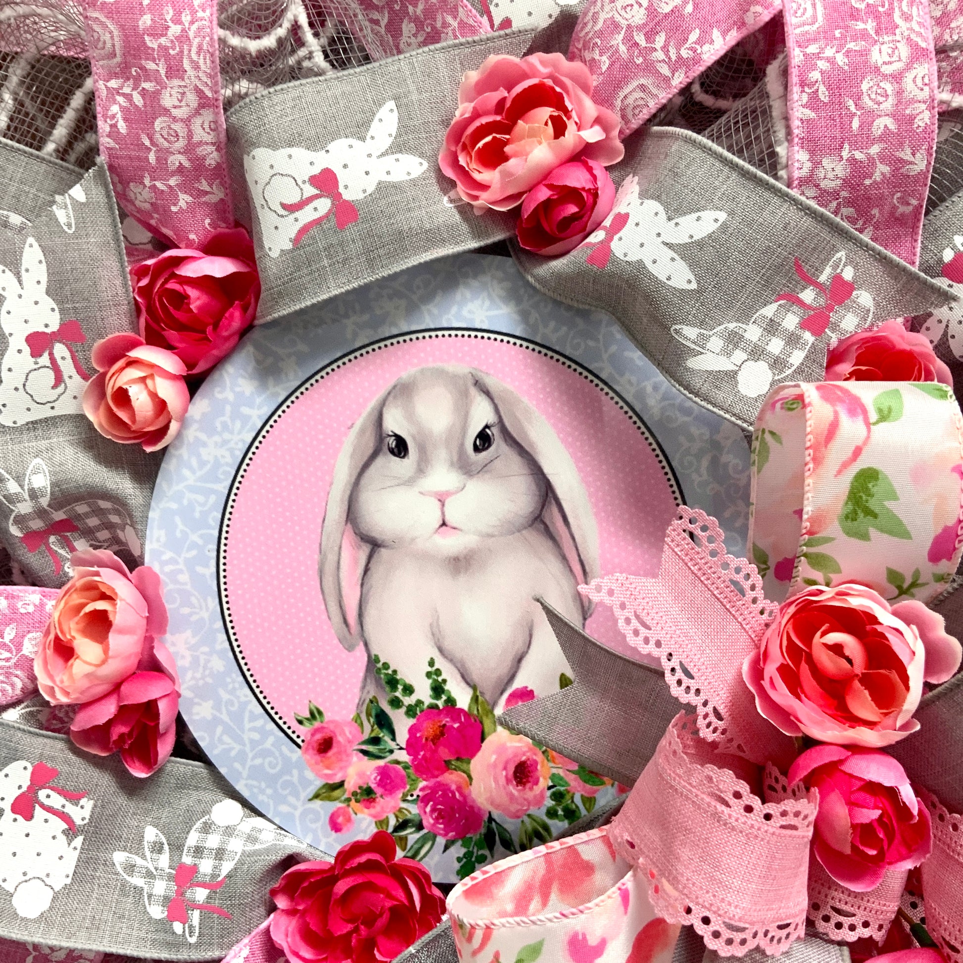 Bring the perfect touch of Spring and Easter to your door with this elegantly beautiful wreath. Soft pastel colors, delicate cabbage roses and soft grey bunny sign bring warm Easter cheer to this wreath. This is a pancake style wreath made to fit behind a storm or screen door but looks lovely on any door.