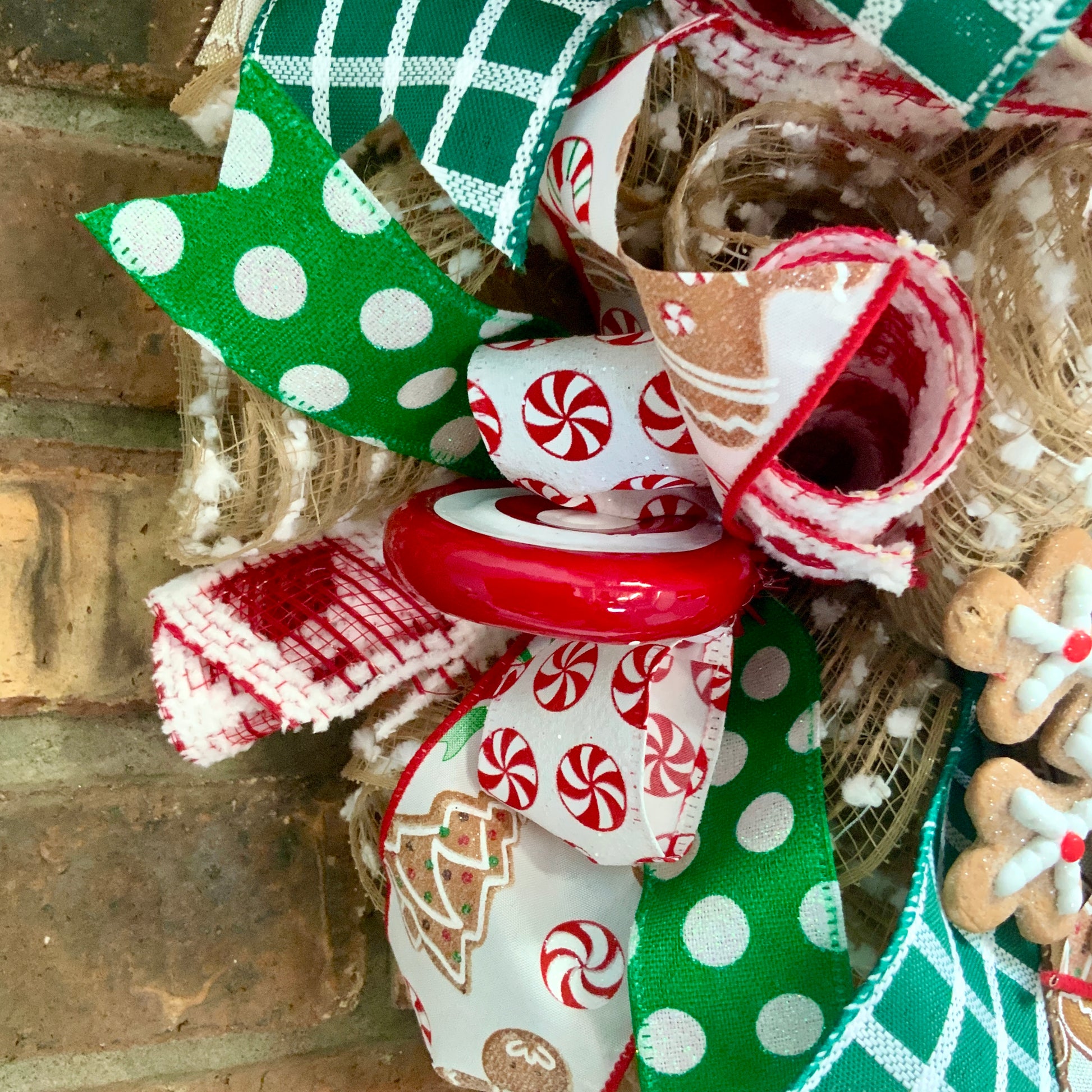 Measuring in at 23 inches in height, 22 inches in width and 10 inches in depth. This wreath is made on a metal wreath frame with a metal sign, deco mesh, wired edge ribbons, plush characters, faux candy picks, clay cookies, fabric cookies, plastic peppermint candy picks and two handmade bows.