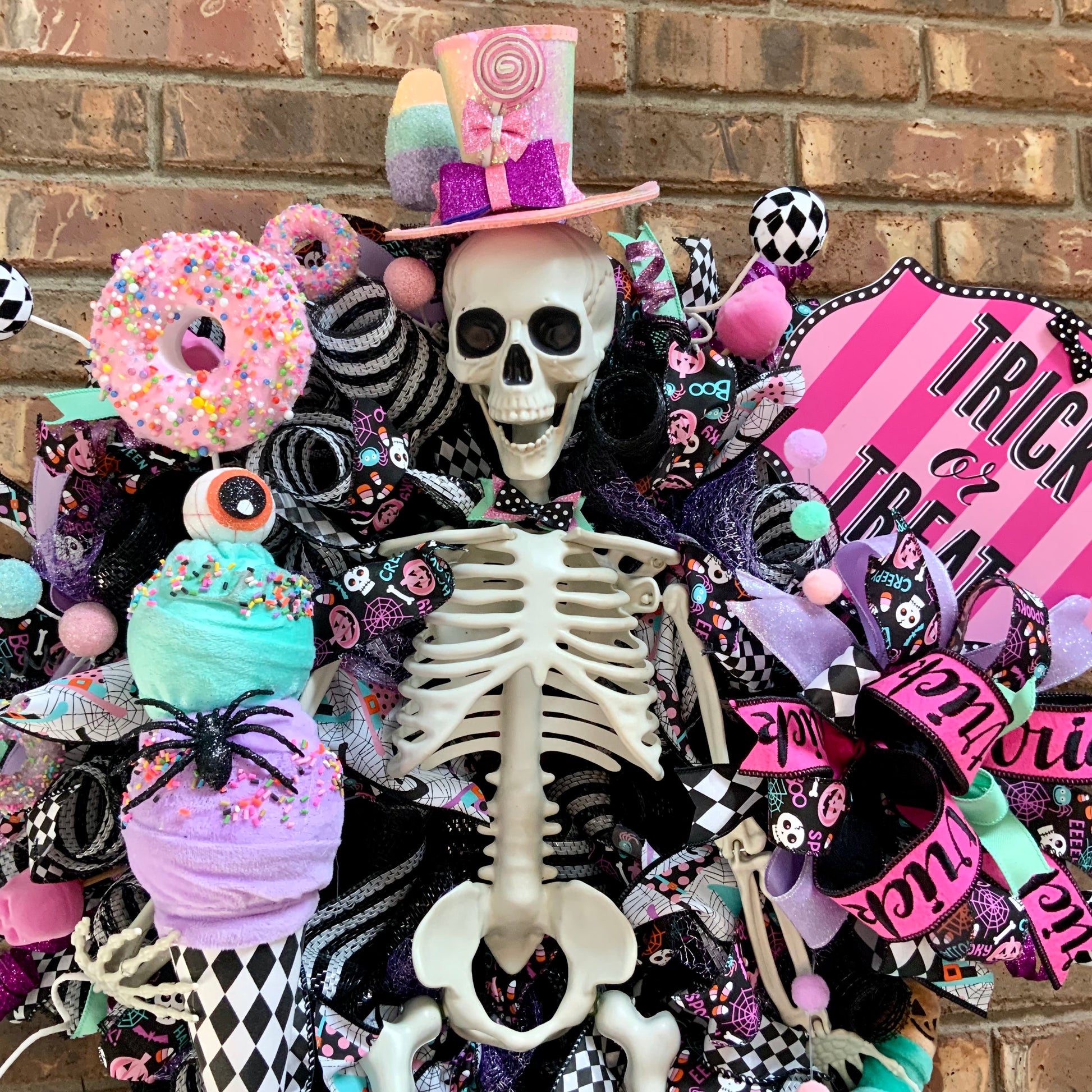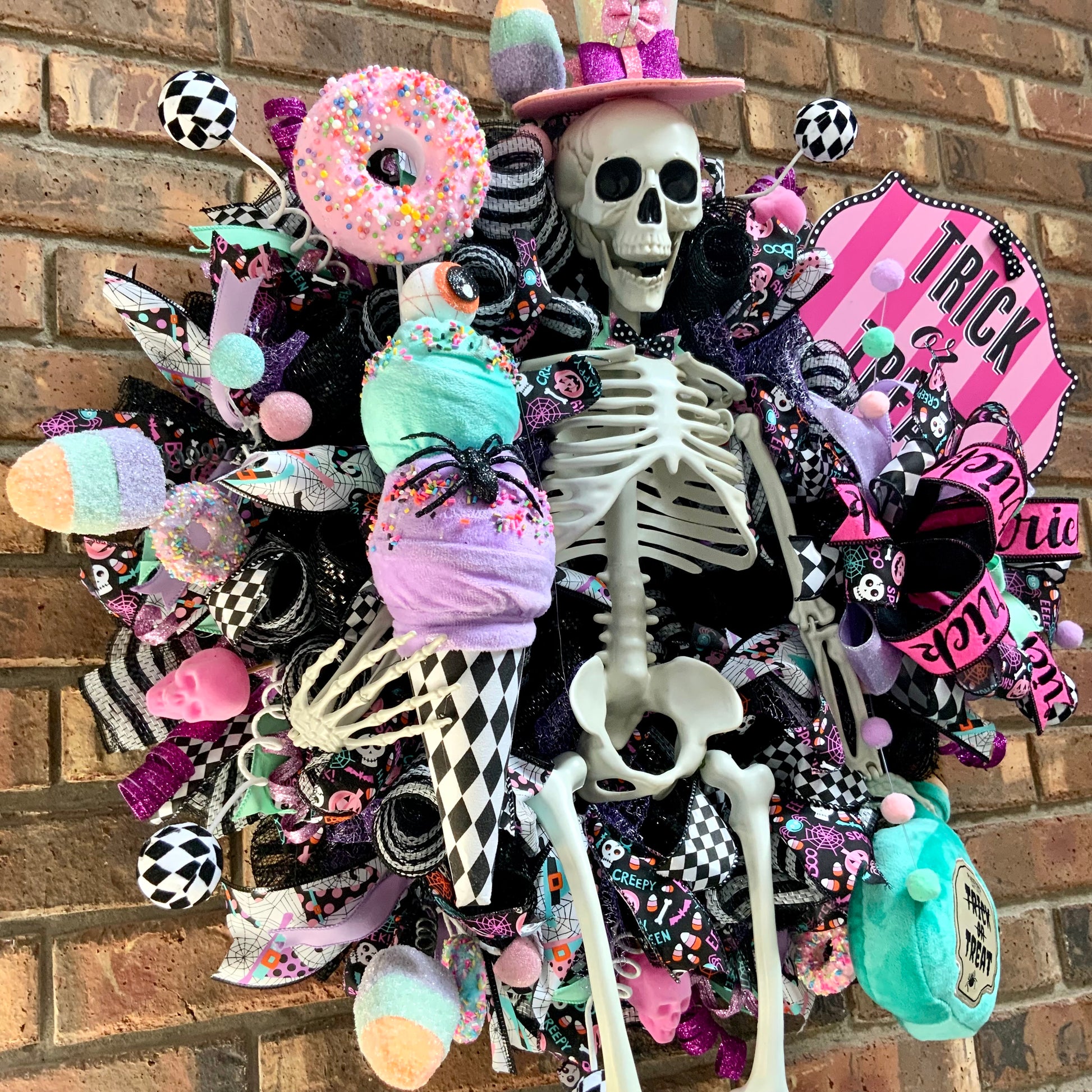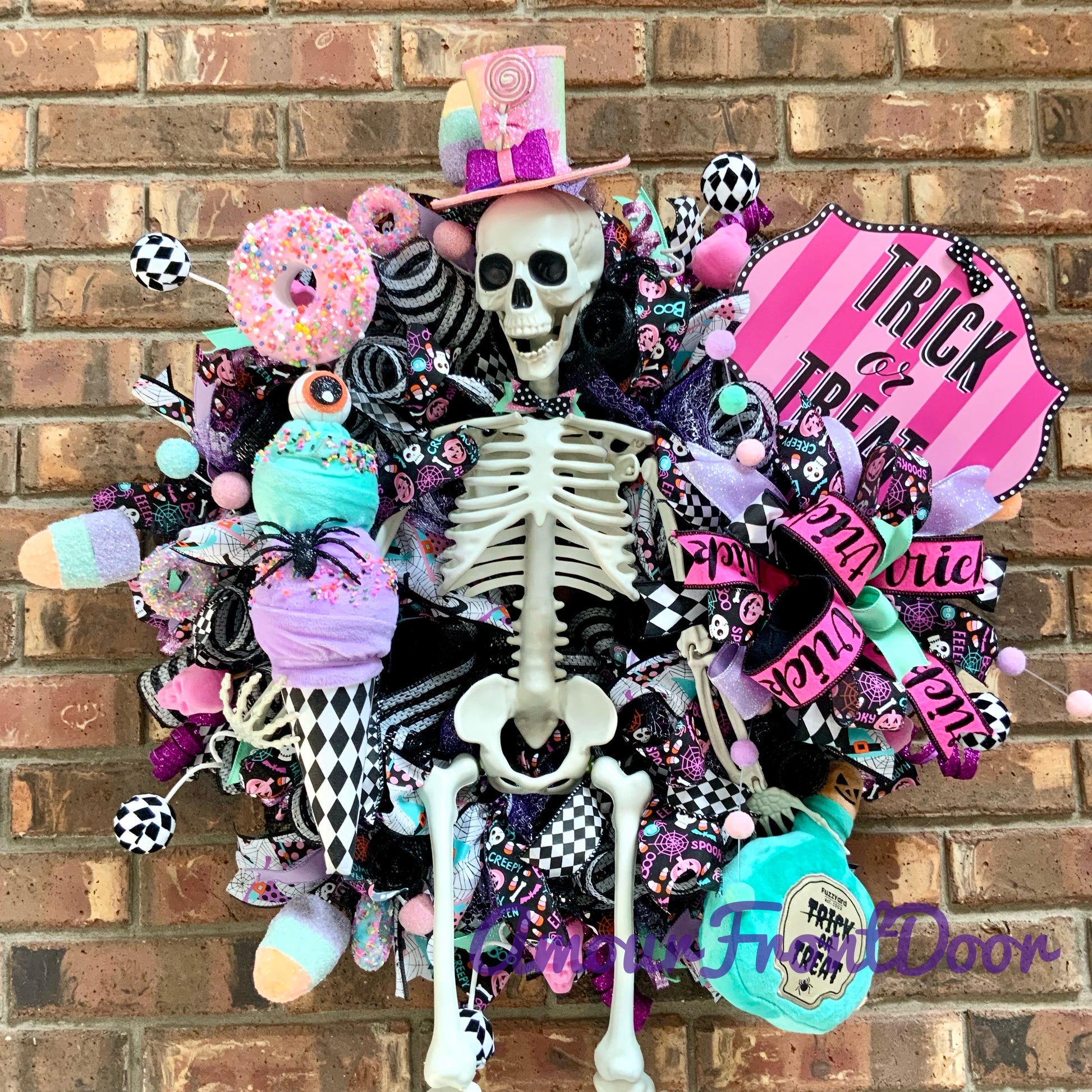 Halloween Pastel Wreath, Skeleton Door Hanger, Trick or Treat Decor, Large Halloween Wreath, Halloween Candy Wreath, Whimsical Halloween Decor, 2025