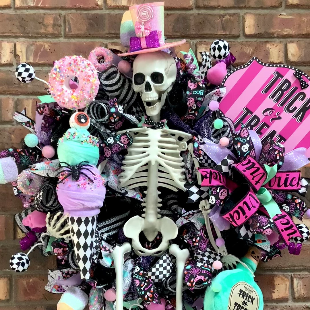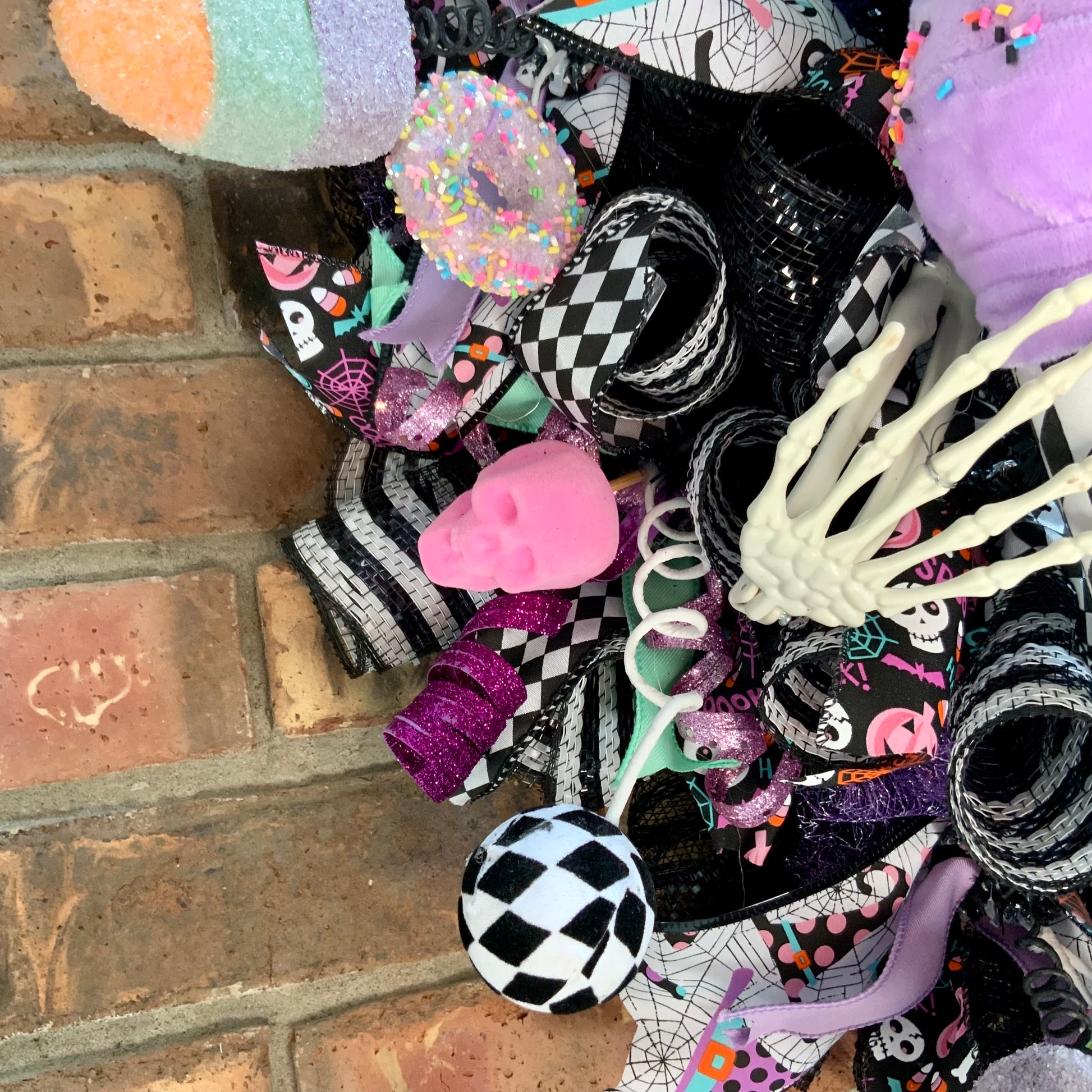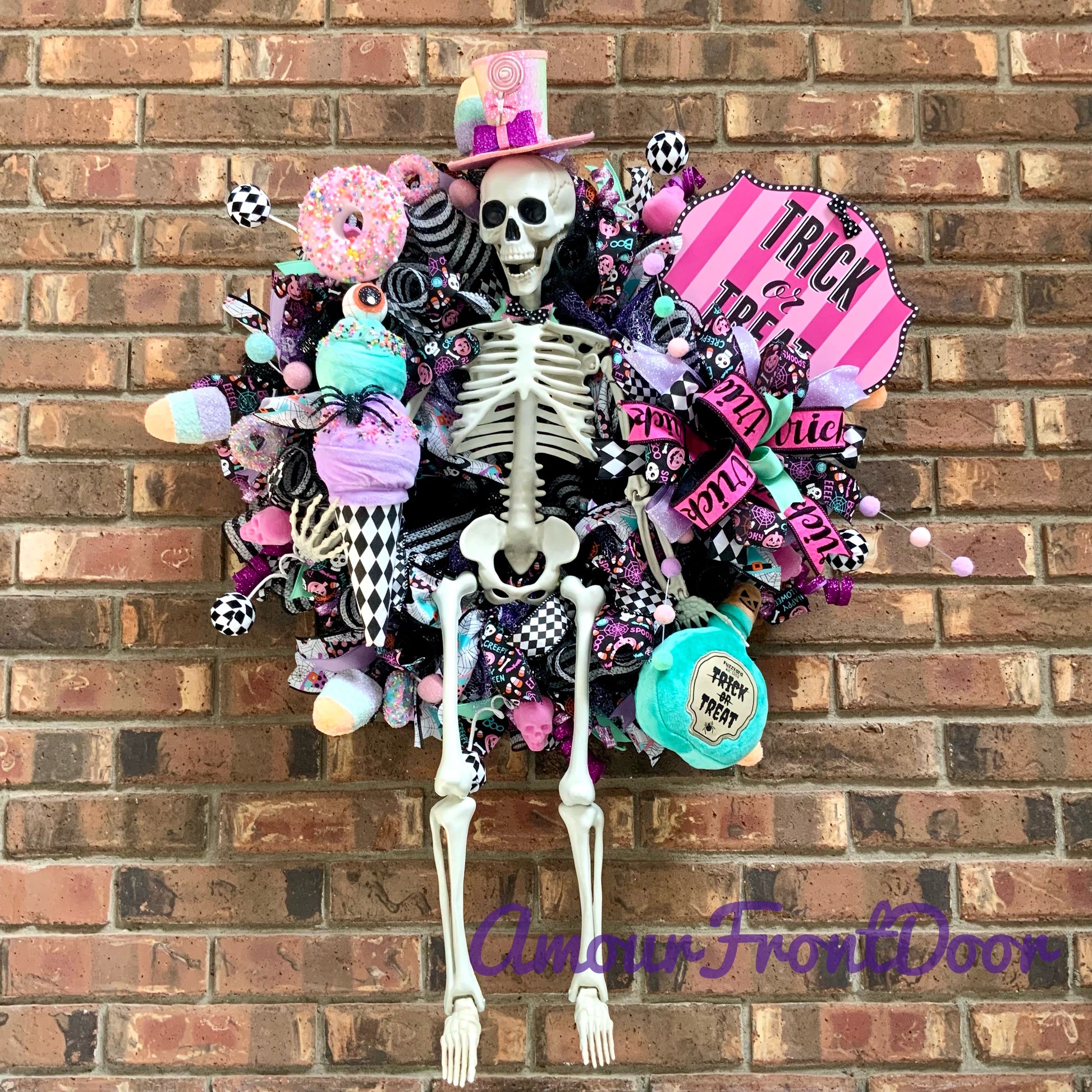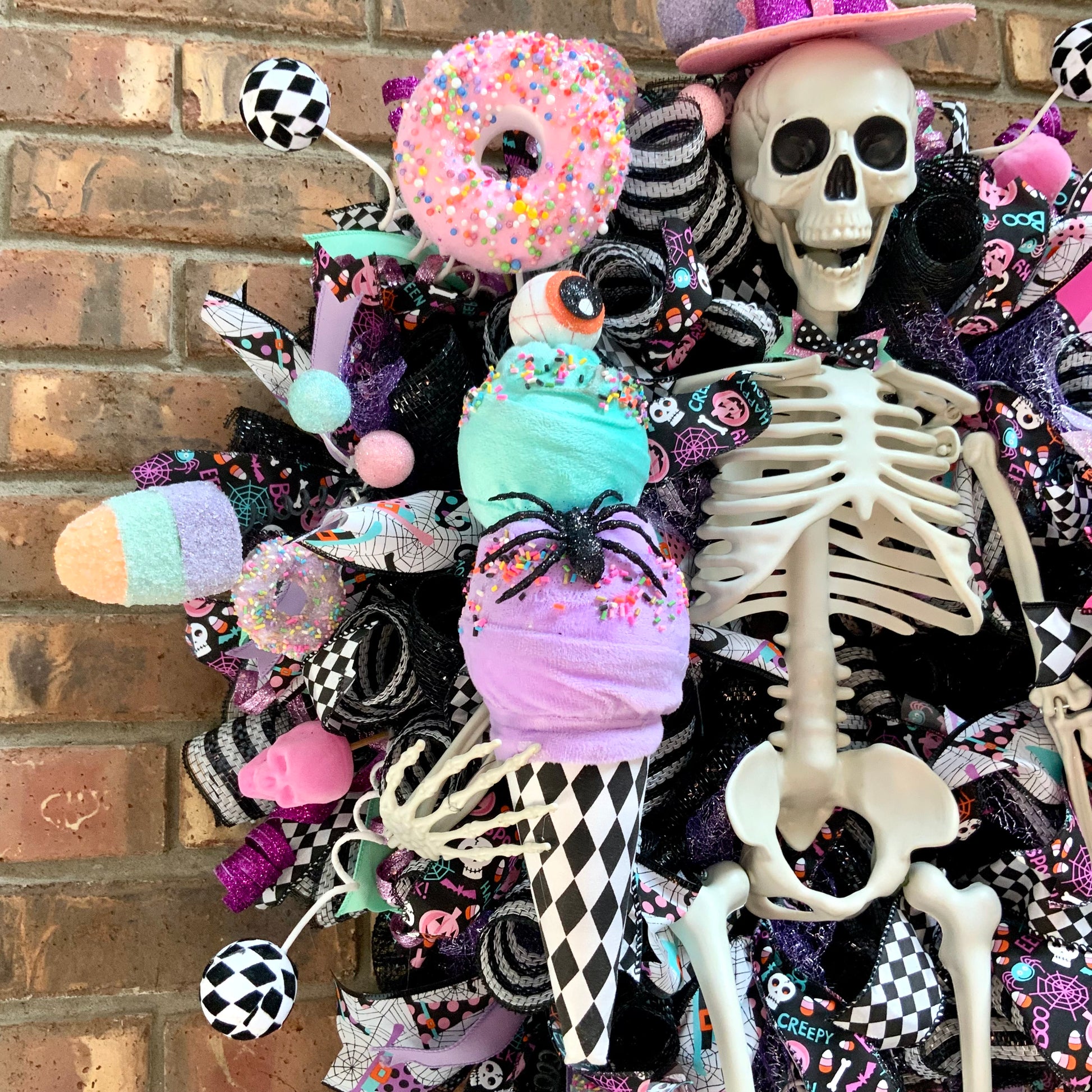 Halloween Pastel Wreath, Skeleton Door Hanger, Trick or Treat Decor, Large Halloween Wreath, Halloween Candy Wreath, Whimsical Halloween Decor, 2025