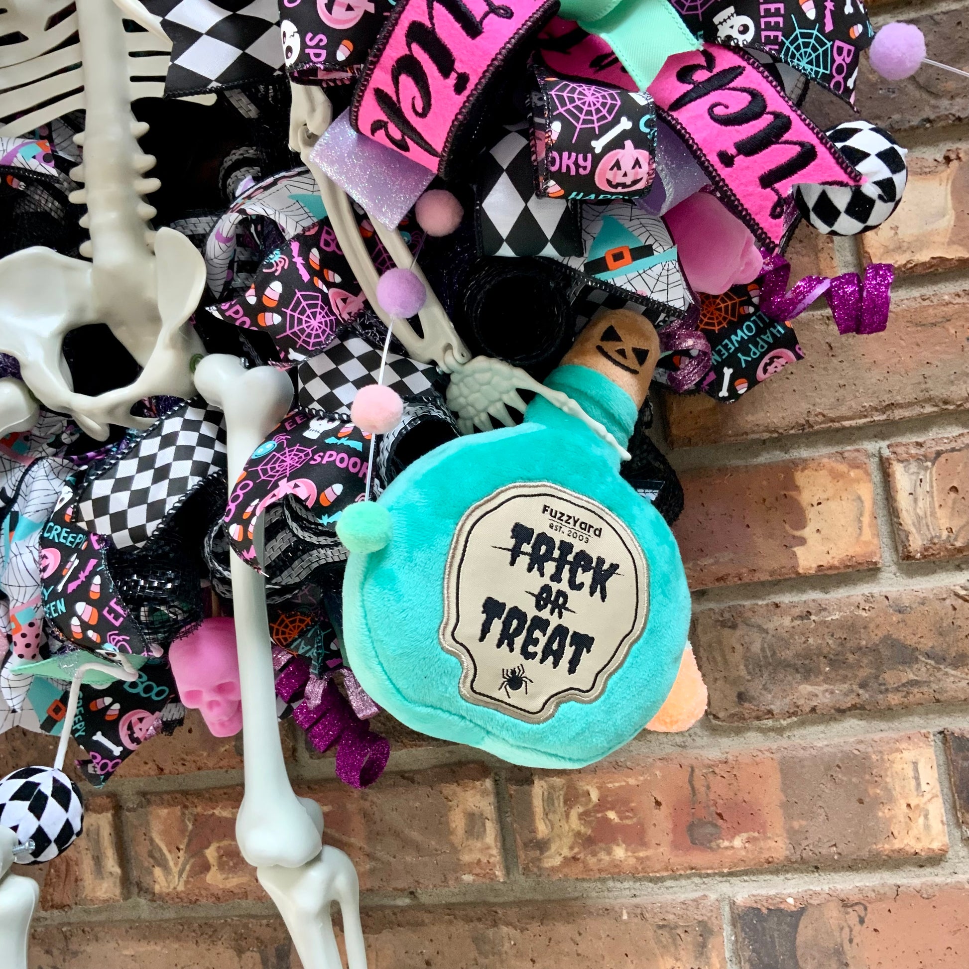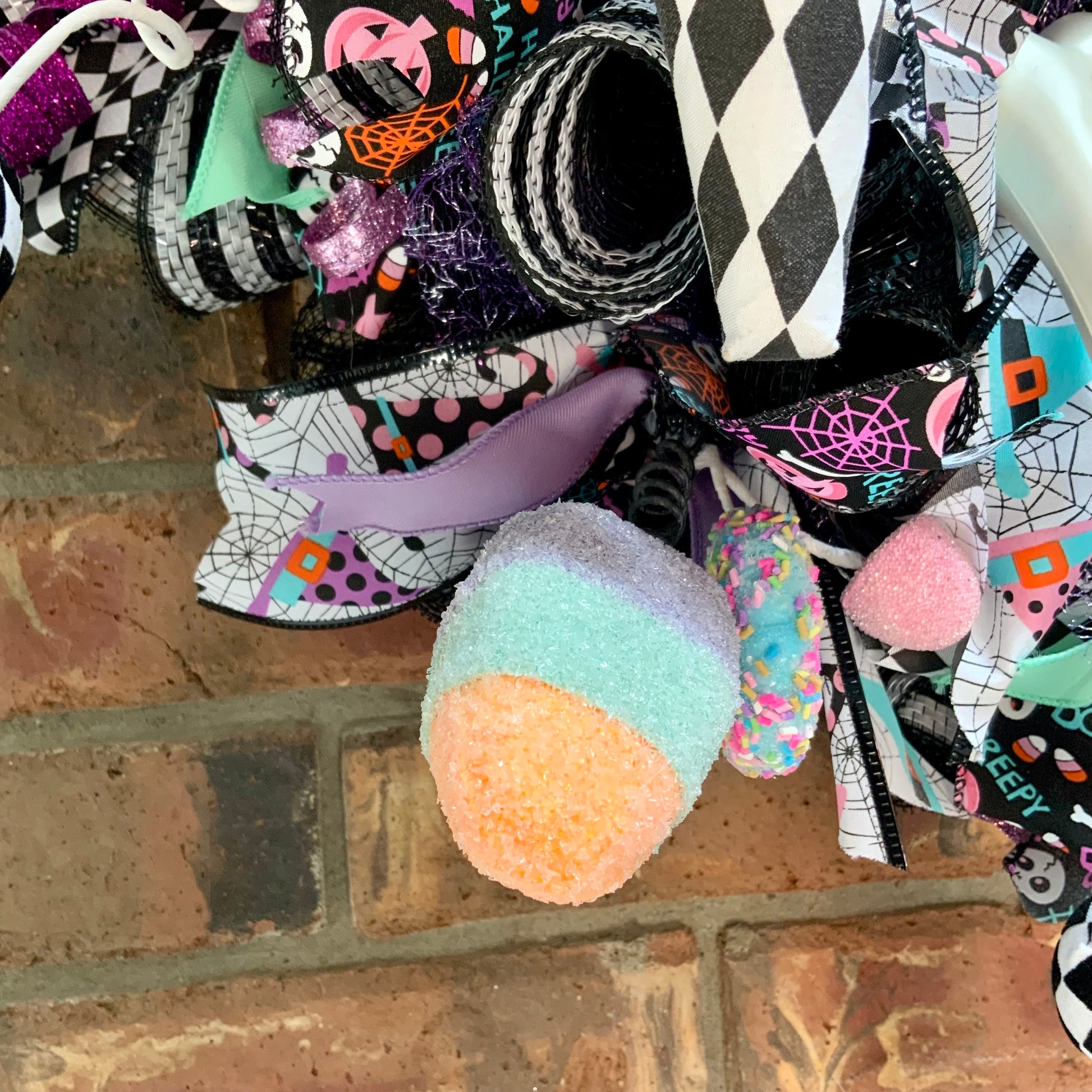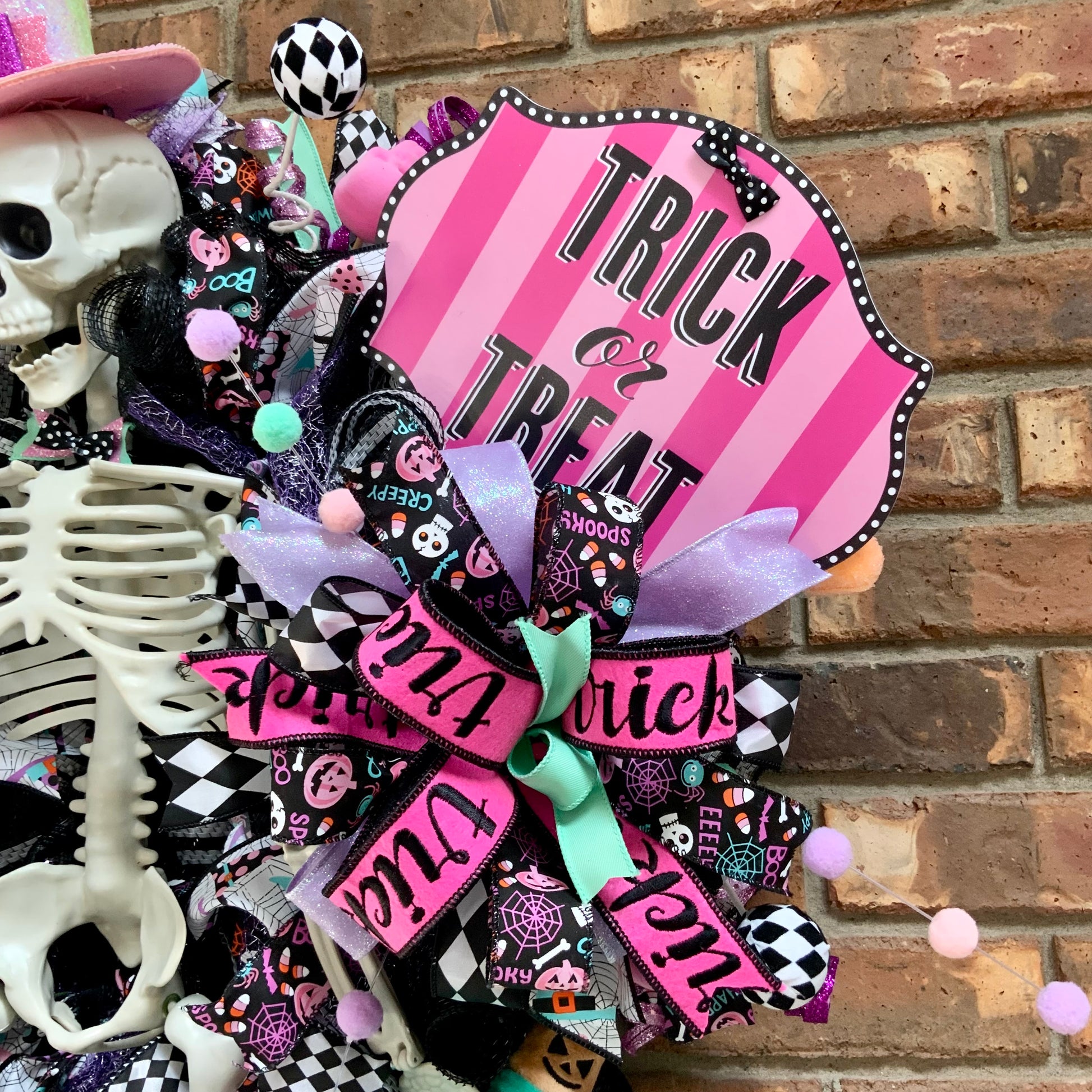 Crafted with pastel colors and whimsical designs, this Halloween wreath adds a playful touch to your decor. Adorned with a Skeleton and "Trick or Treat" sign, this large candy-inspired wreath is perfect for welcoming trick-or-treaters. Spookify your home with this unique and festive Halloween decoration.