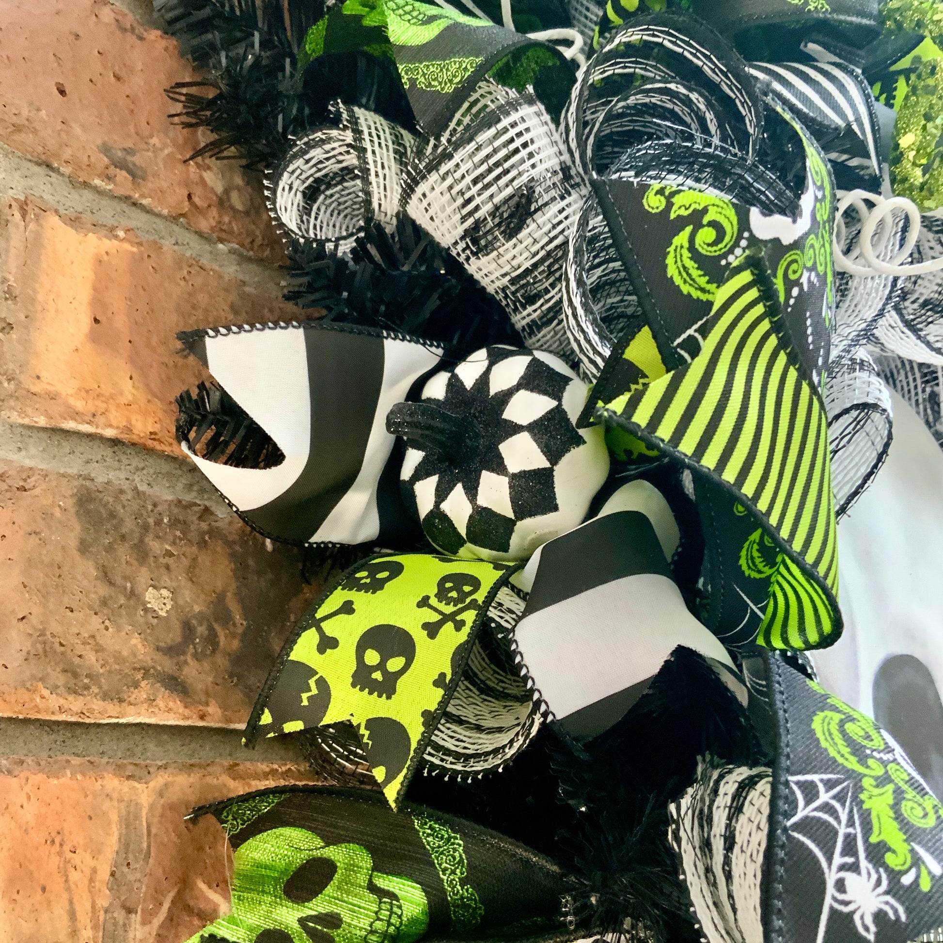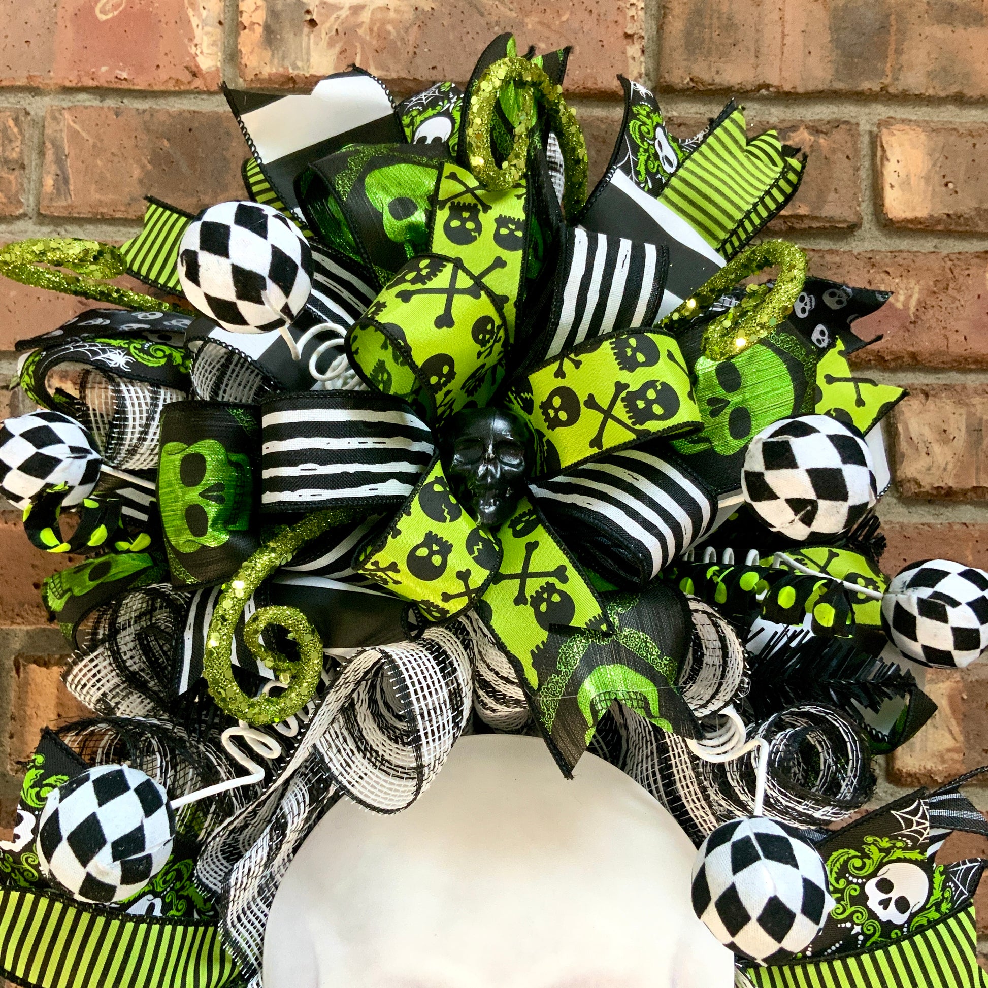 Measuring in at 36 inches in height, 16 inches in width and 9 inches in depth. This wreath is made on a 30” swag with deco mesh, wired edge ribbons, wooden sign, plastic skulls, faux feathers, glittered picks, foam picks, foam glittered pumpkins, fabric curls and two handmade bows.