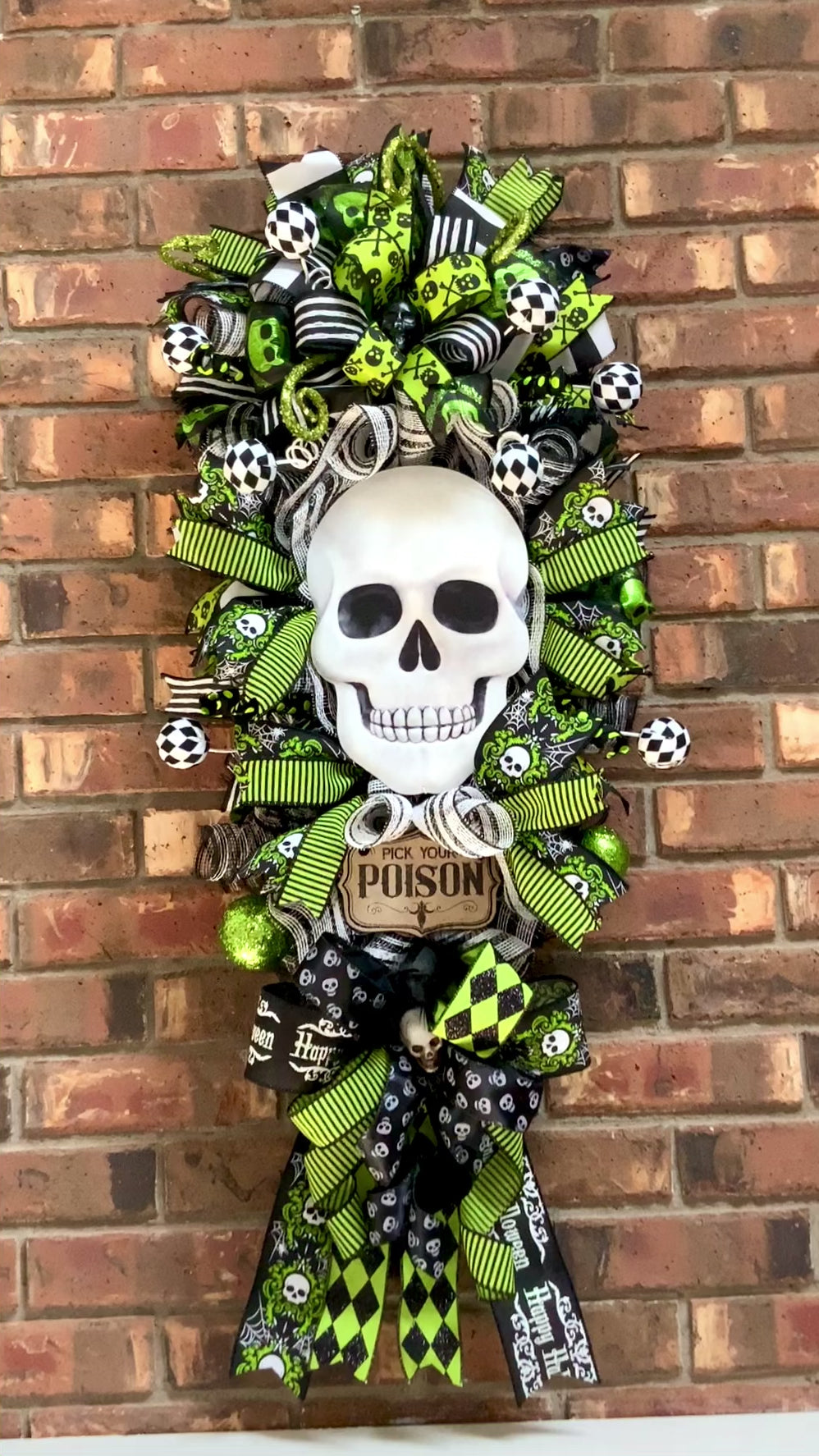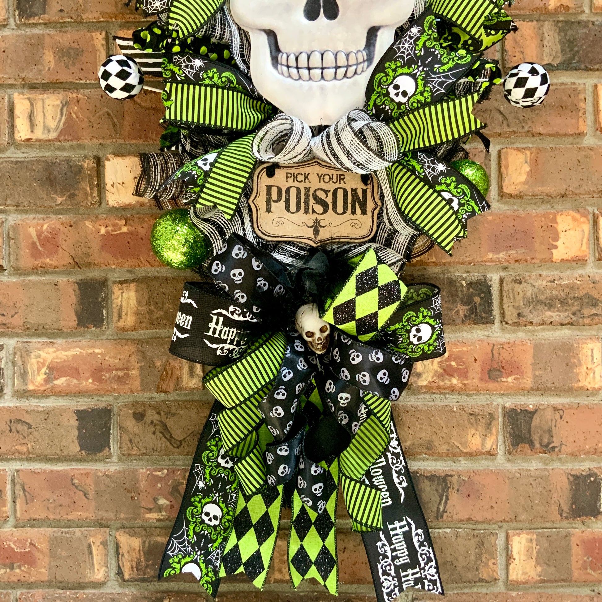 Welcome your guests with our spooky Halloween swag and large wreath featuring a skeleton and skull decor. The "Pick Your Poison" sign adds the perfect touch of eerie excitement to your Halloween decor. Made with care for a devilishly delightful entrance.