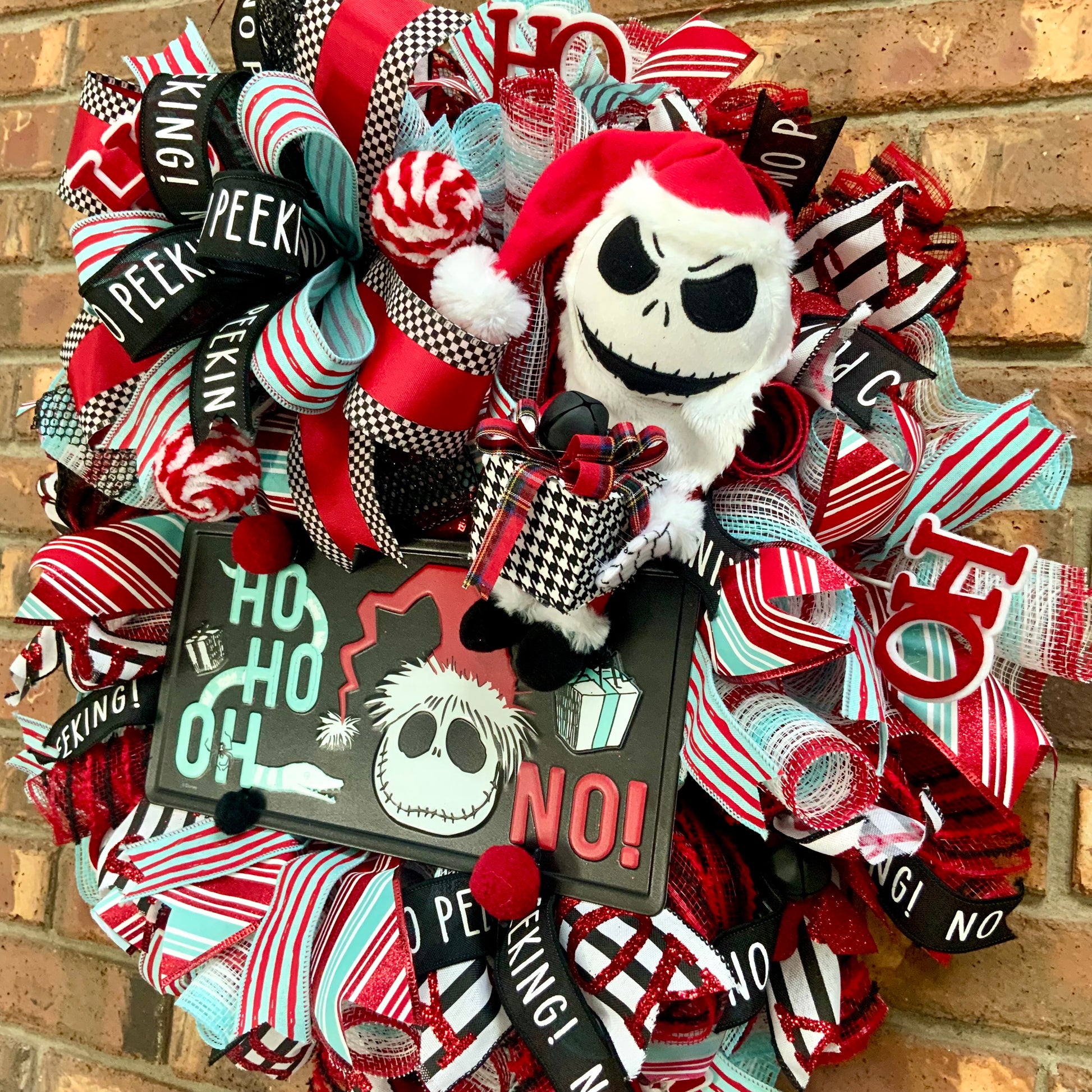 Celebrate the holiday season with this large whimsical Christmas wreath featuring Jack Skellington dressed as Santa. Accented with candy-striped décor and a playful "Ho Ho Oh No" sign, it brings a unique twist to traditional Christmas decorations. Perfect for adding personality and festive charm to your front door, this wreath blends classic holiday spirit with a fun touch.