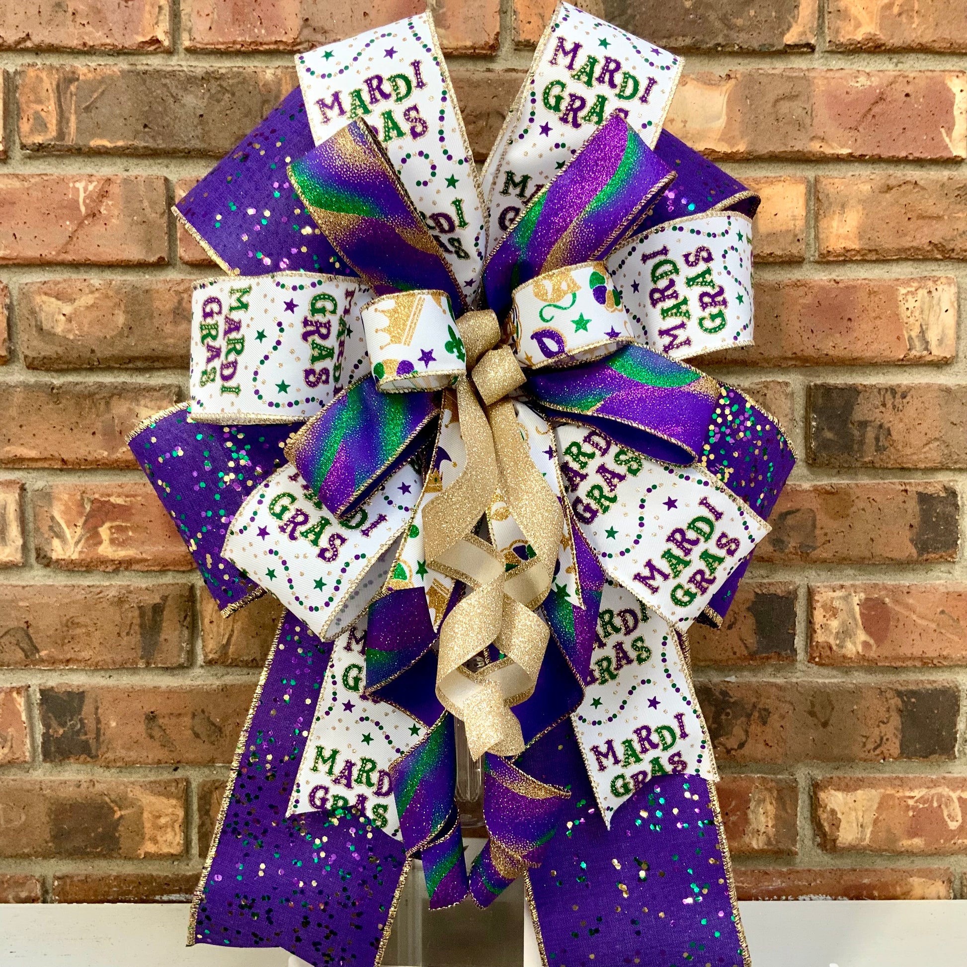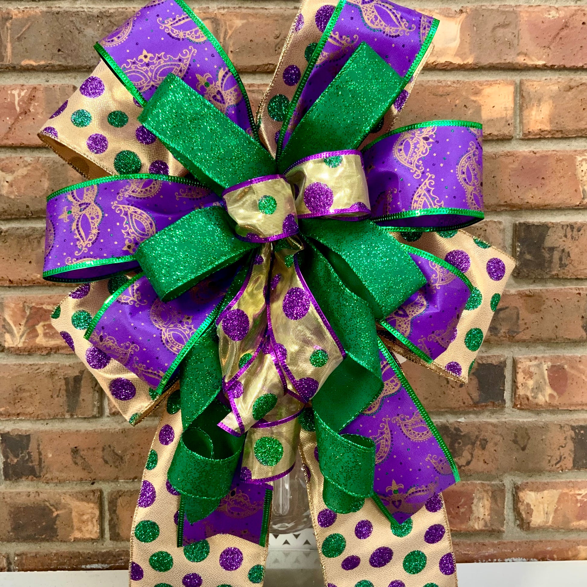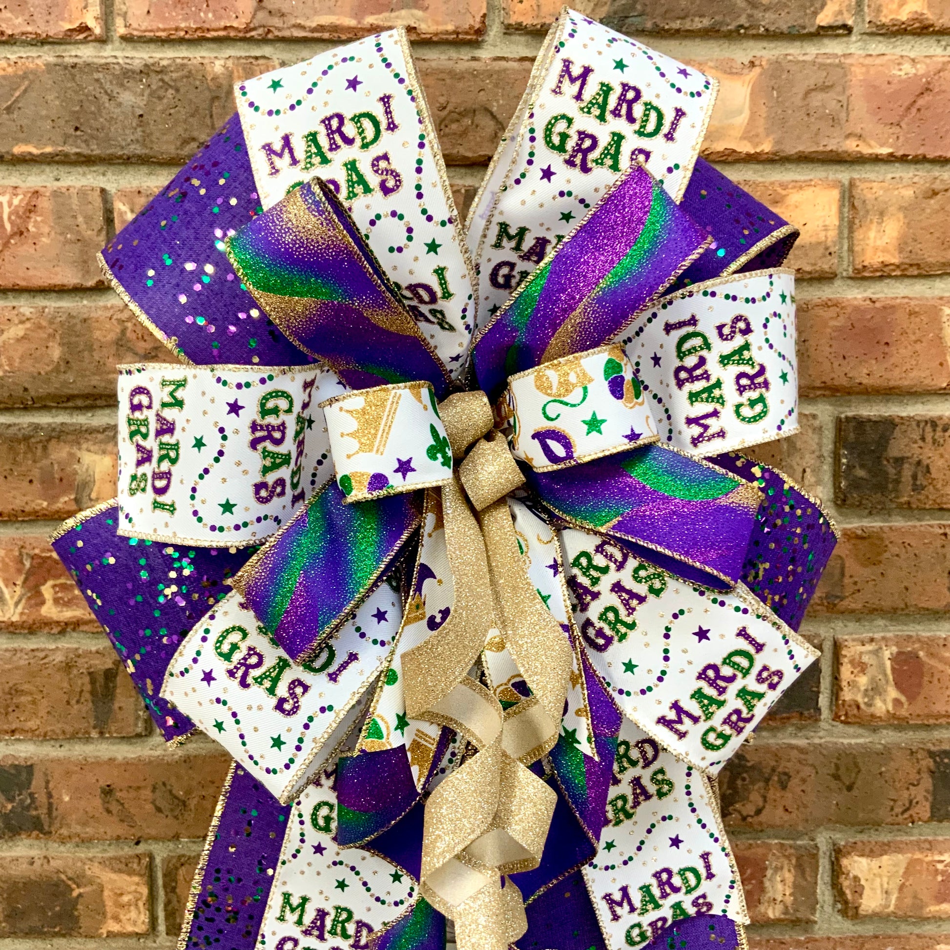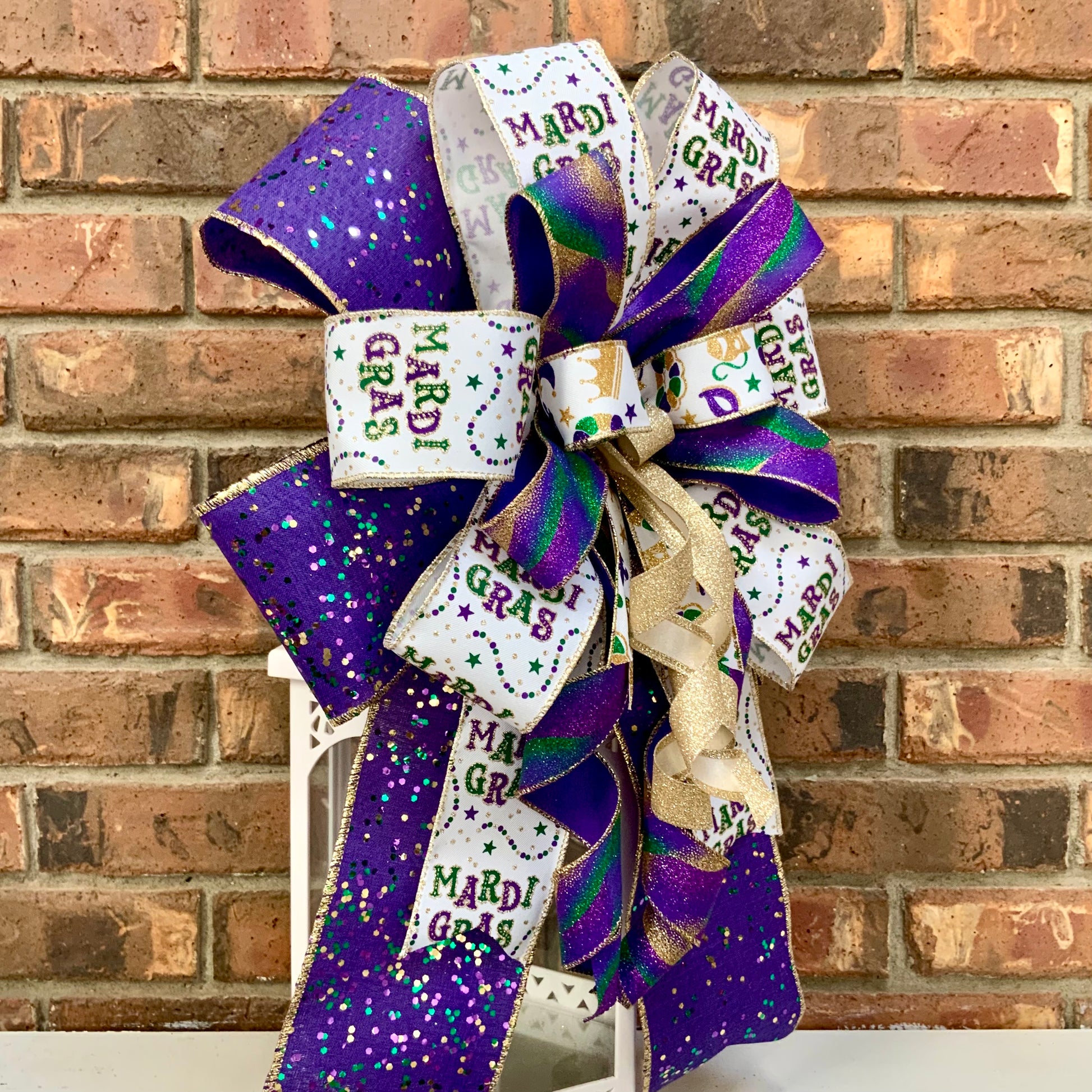Laissez les bons temps rouler! This festive Mardi Gras bow brings the vibrant spirit of New Orleans to your holiday decor with traditional purple, gold, and green colors. Perfect for Fat Tuesday celebrations, this eye-catching bow features glittered ribbons for authentic Mardi Gras flair, with some styles showcasing playful mask patterns. Whether you're decorating for a Mardi Gras party or celebrating the season, this versatile bow adds a festive touch to wreaths, lanterns, mailboxes, and sconces.