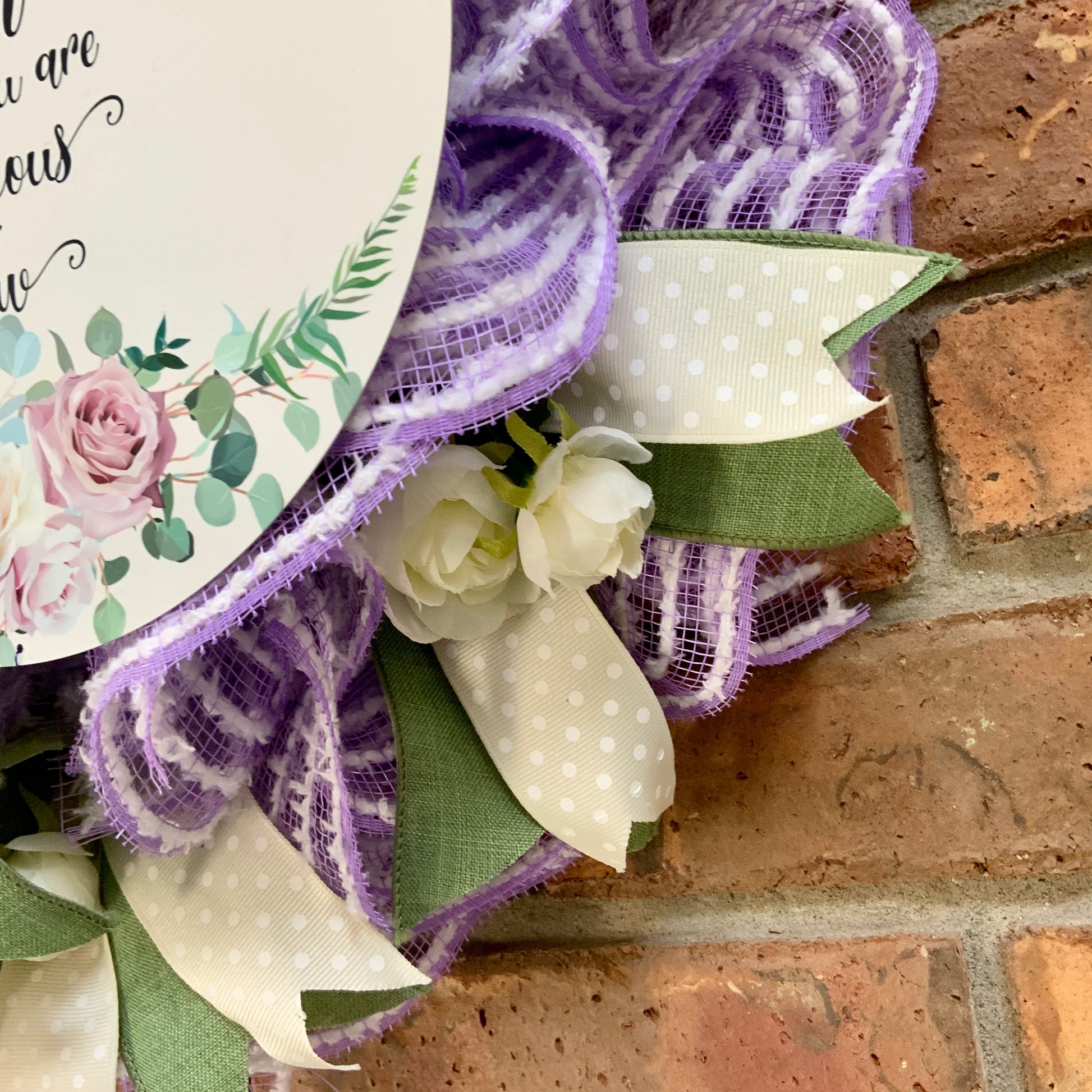 Elegant beauty along with a lovely message makes this wreath a perfect gift for any mom. Lavender and cream make a calm and welcoming base for this wreath combined with petite roses, handmade bows and a beautiful sign all to convey love and gratitude to that special mom. This is the perfect gift for Mother’s Day, birthdays, new moms and just to say I love you.