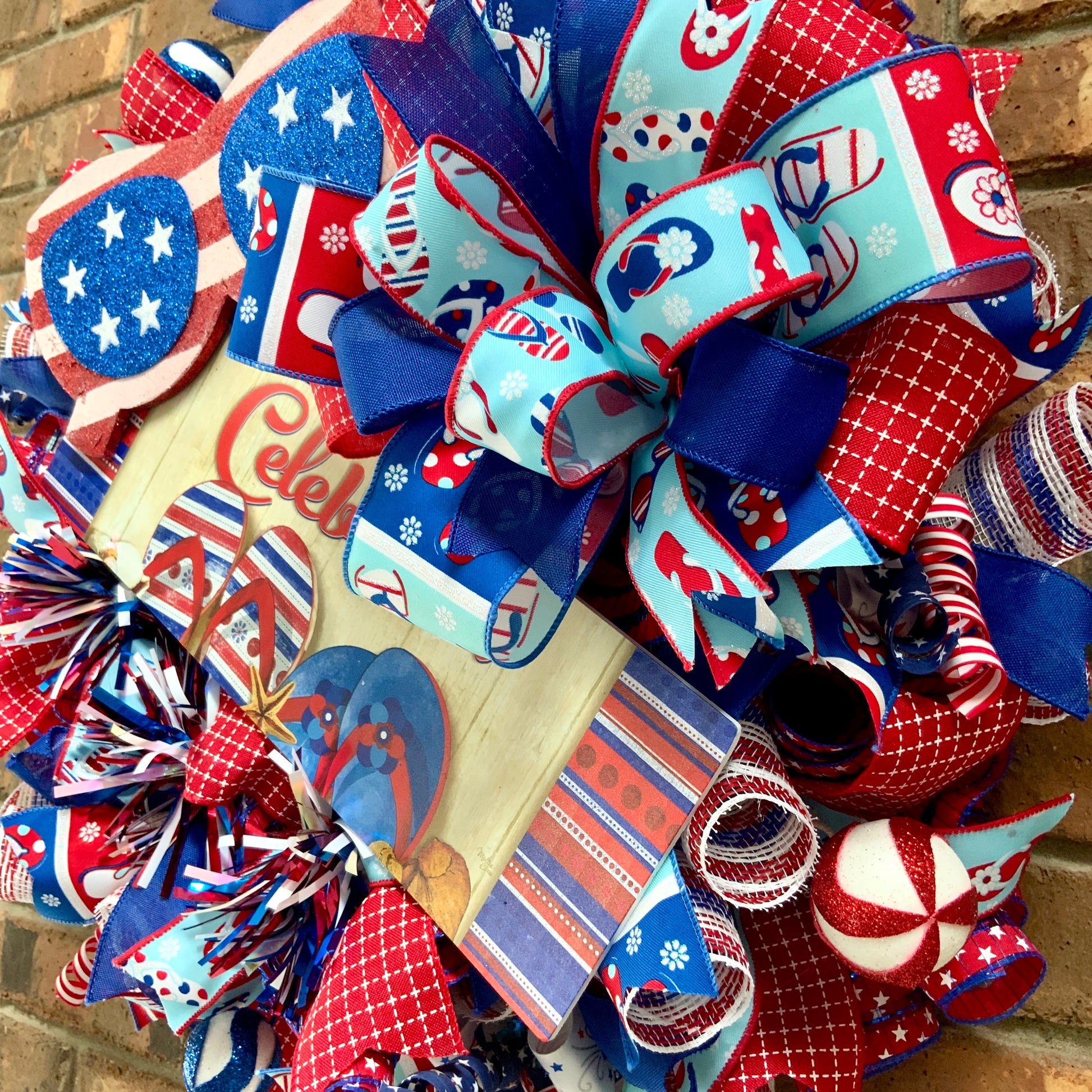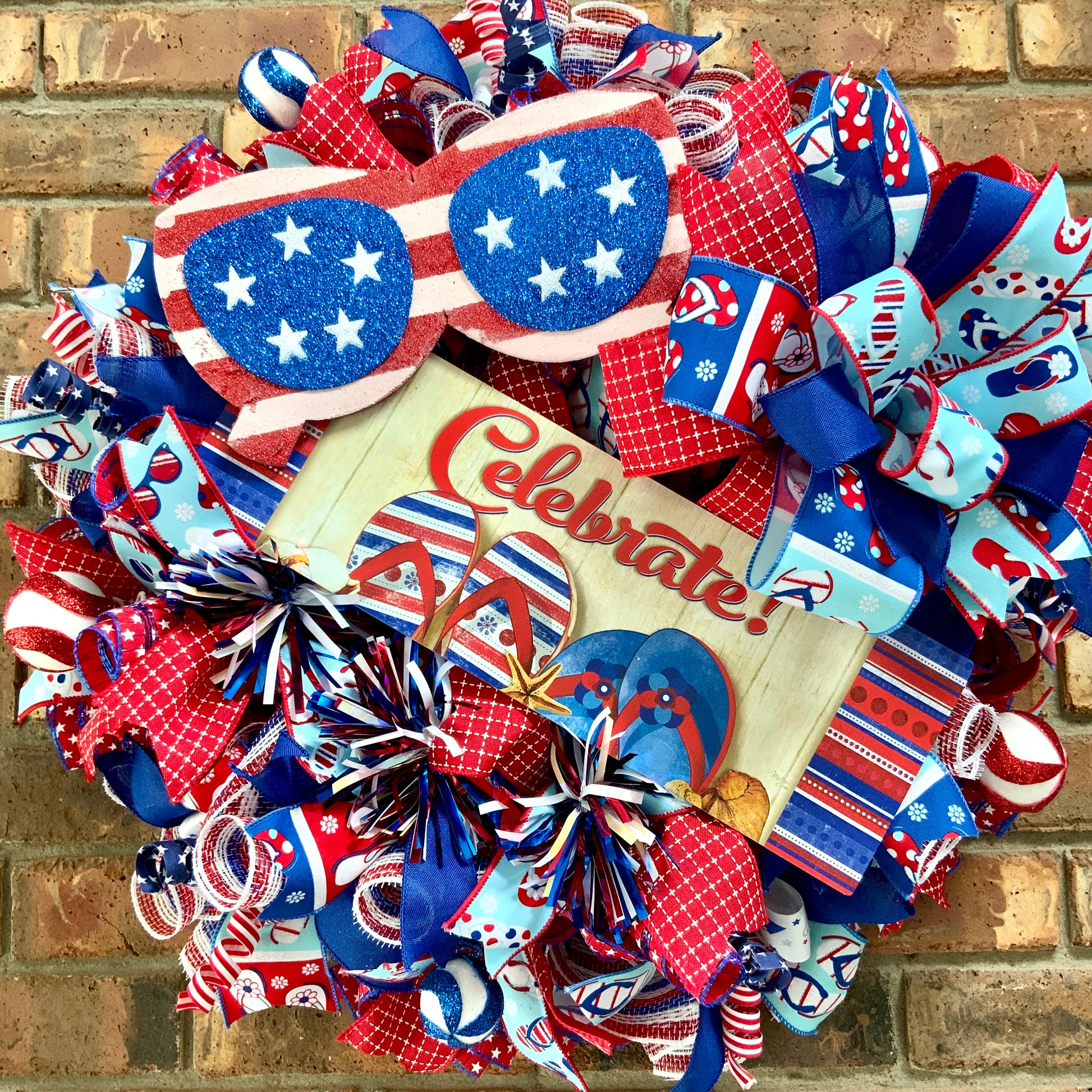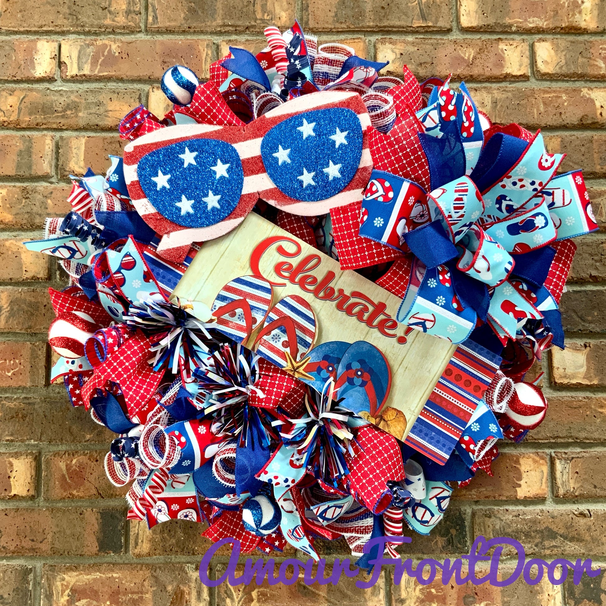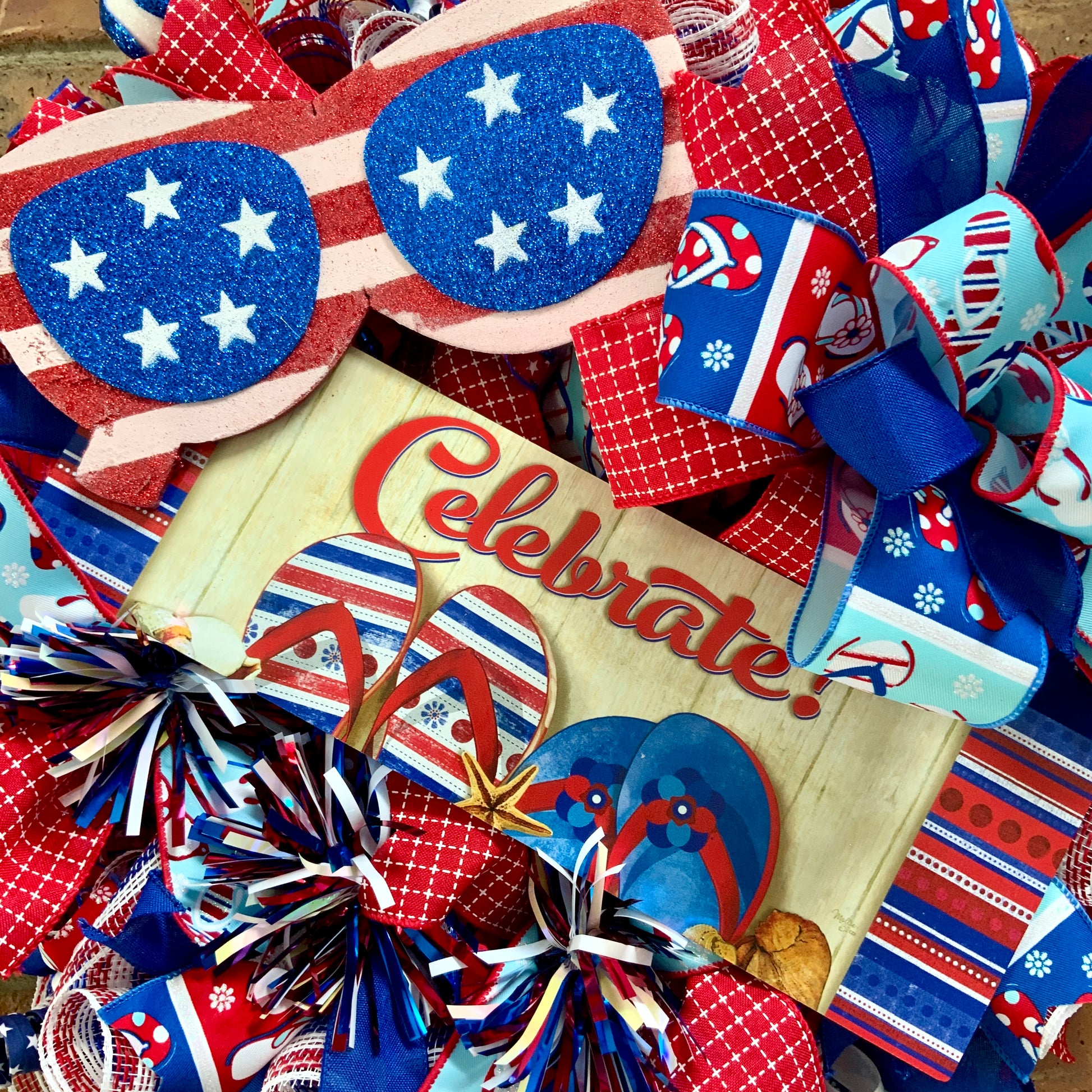 Celebrate is a bright, fun and patriotic wreath for the upcoming holidays of Memorial Day and Independence Day. Make your door stand out with a bright welcome by adding this beautiful wreath to your home. It’s perfect for Patriotic holidays and the entire Summer season.