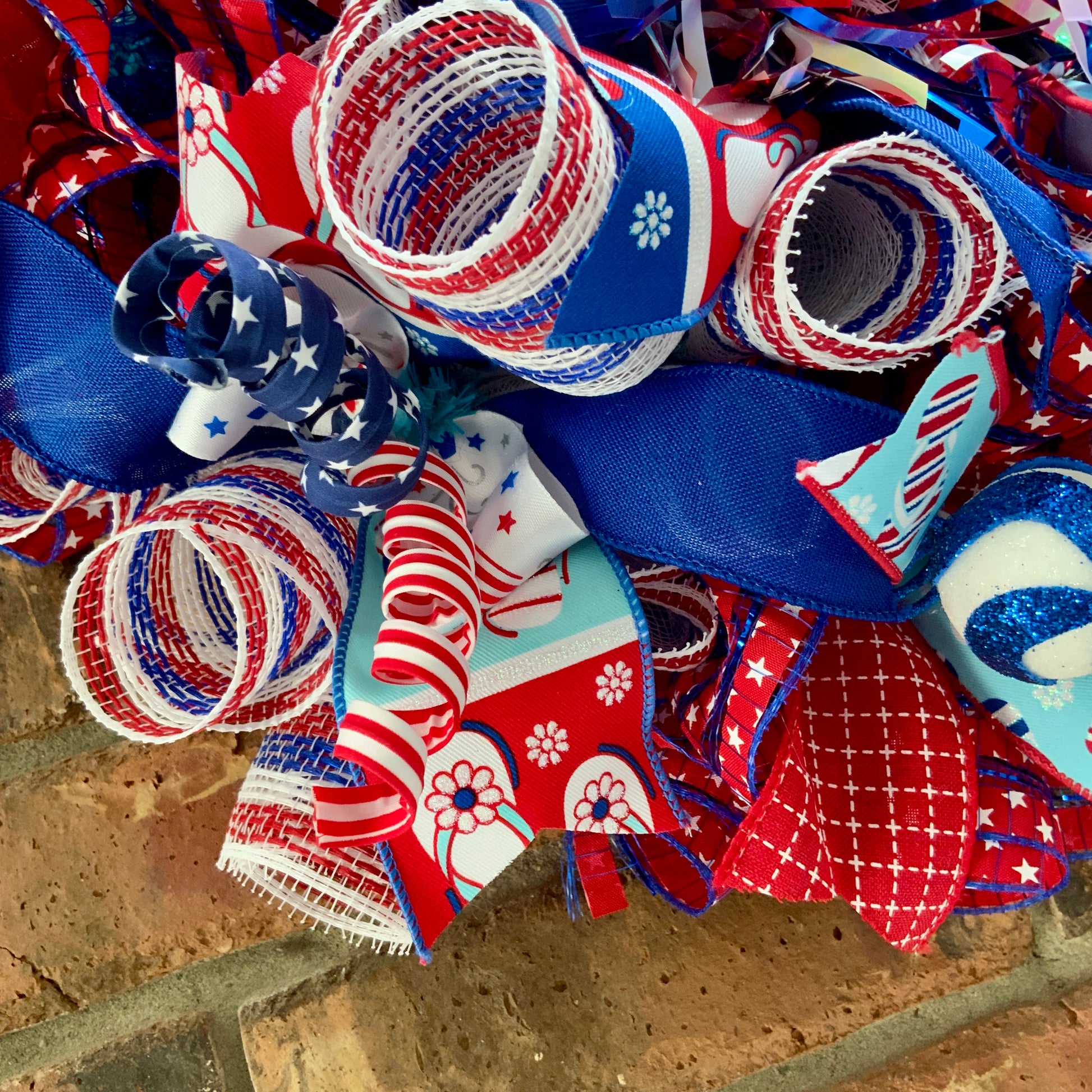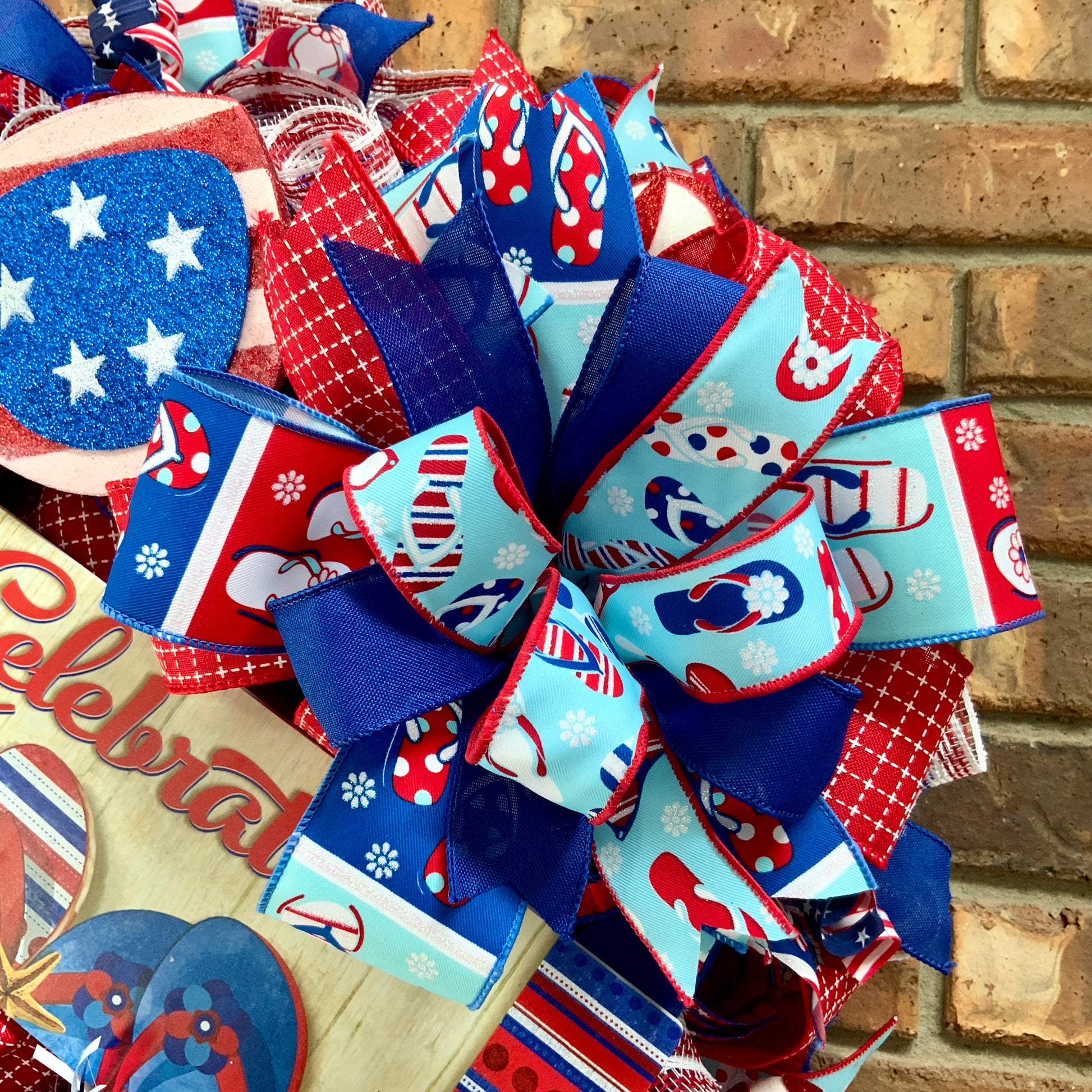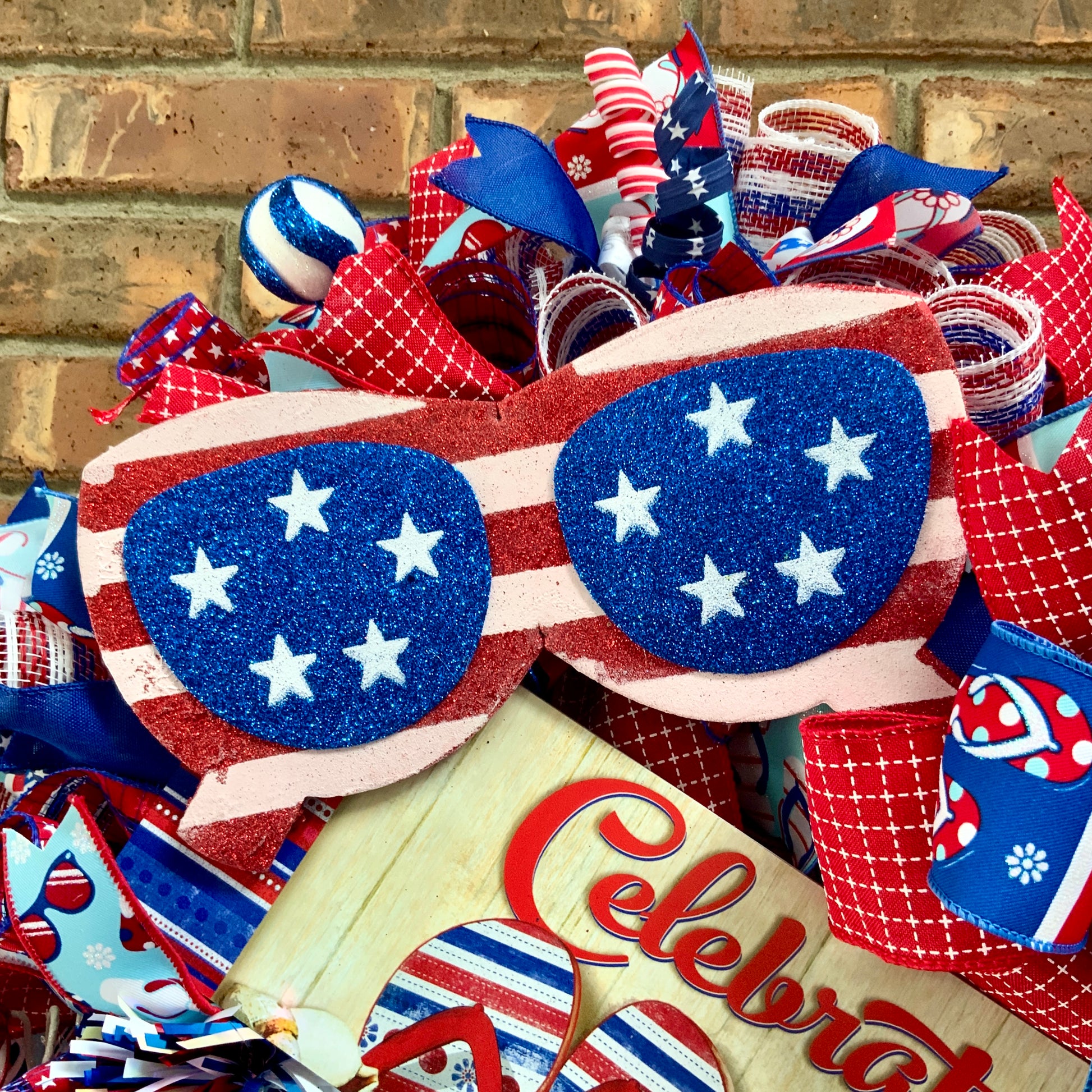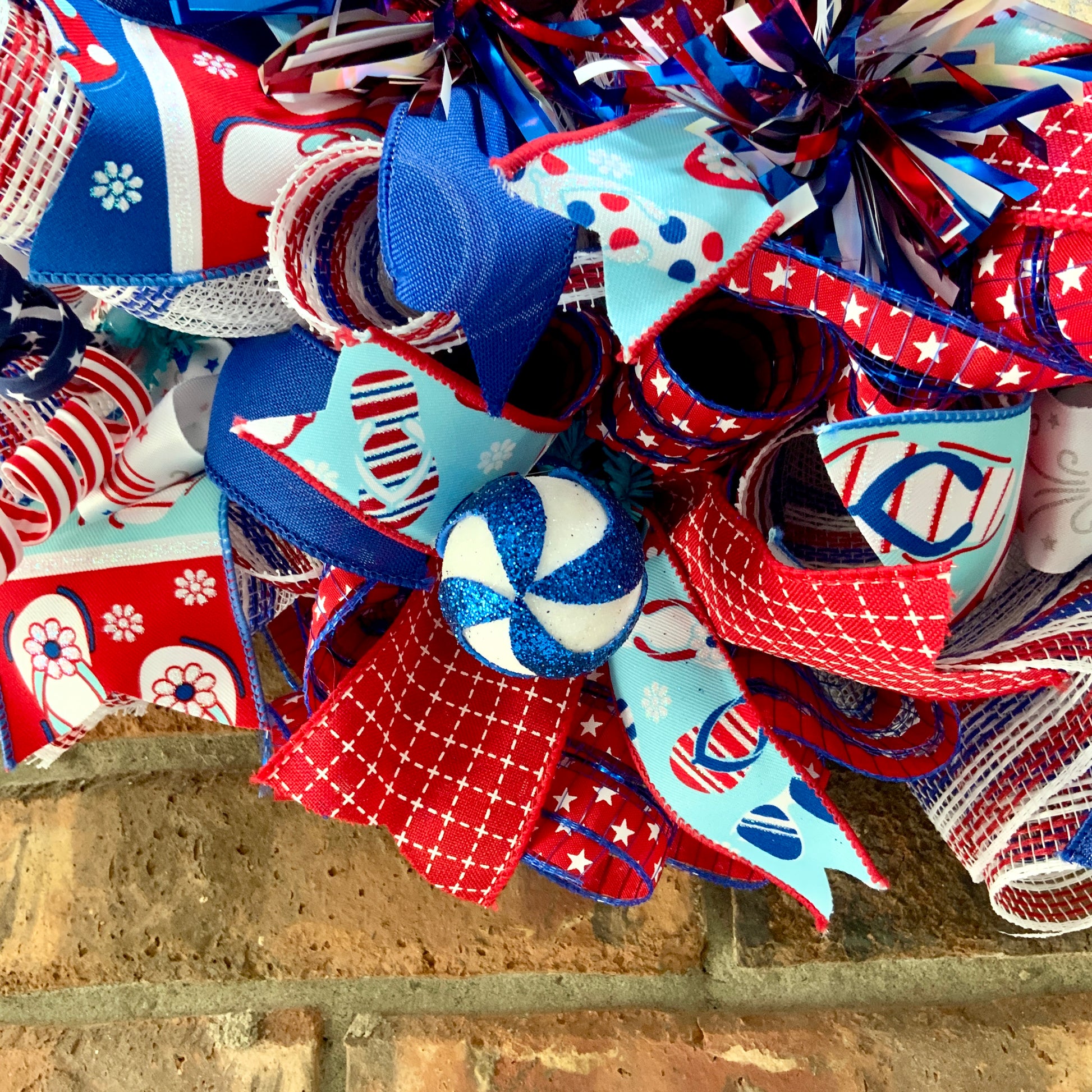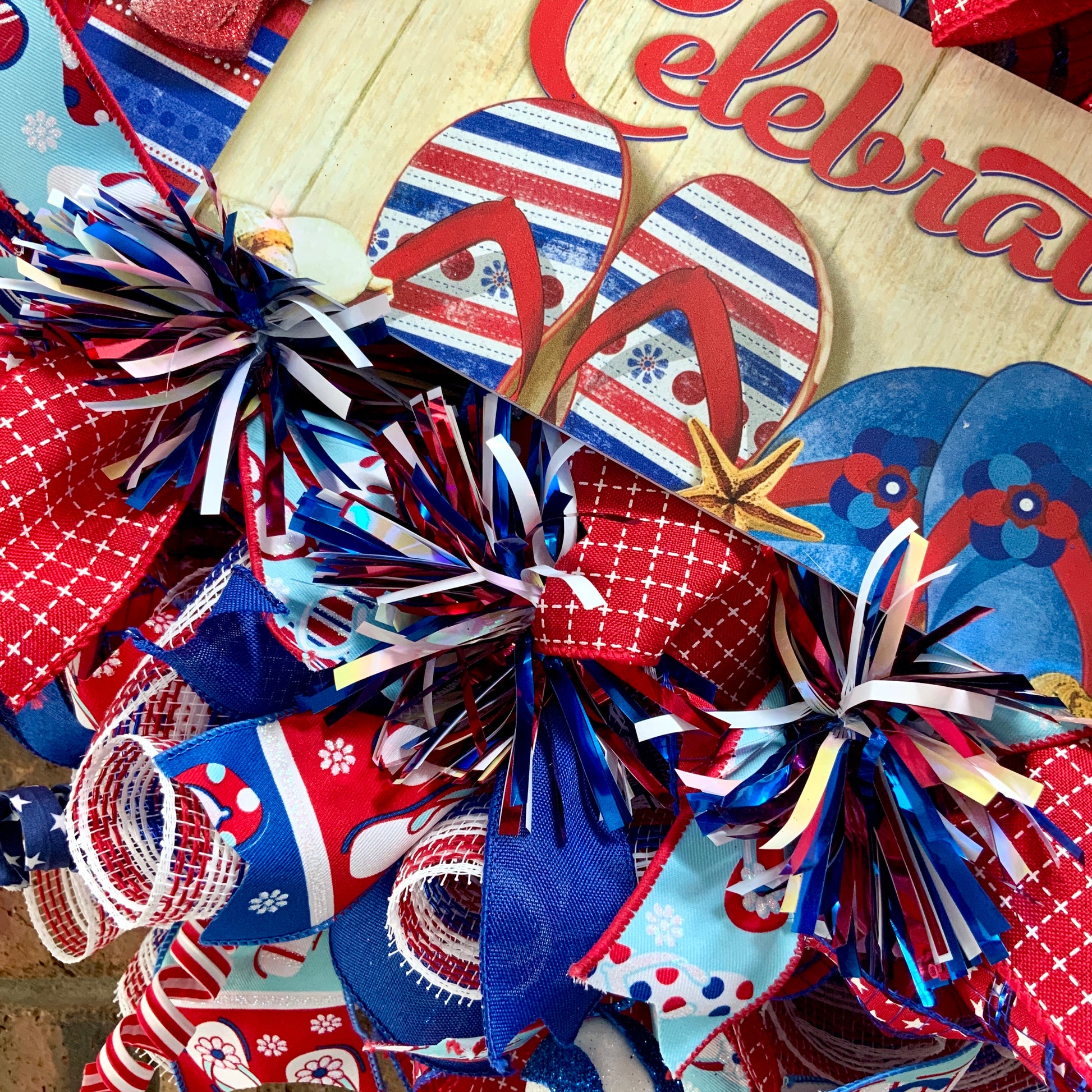 Celebrate is a bright, fun and patriotic wreath for the upcoming holidays of Memorial Day and Independence Day. Make your door stand out with a bright welcome by adding this beautiful wreath to your home. It’s perfect for Patriotic holidays and the entire Summer season.