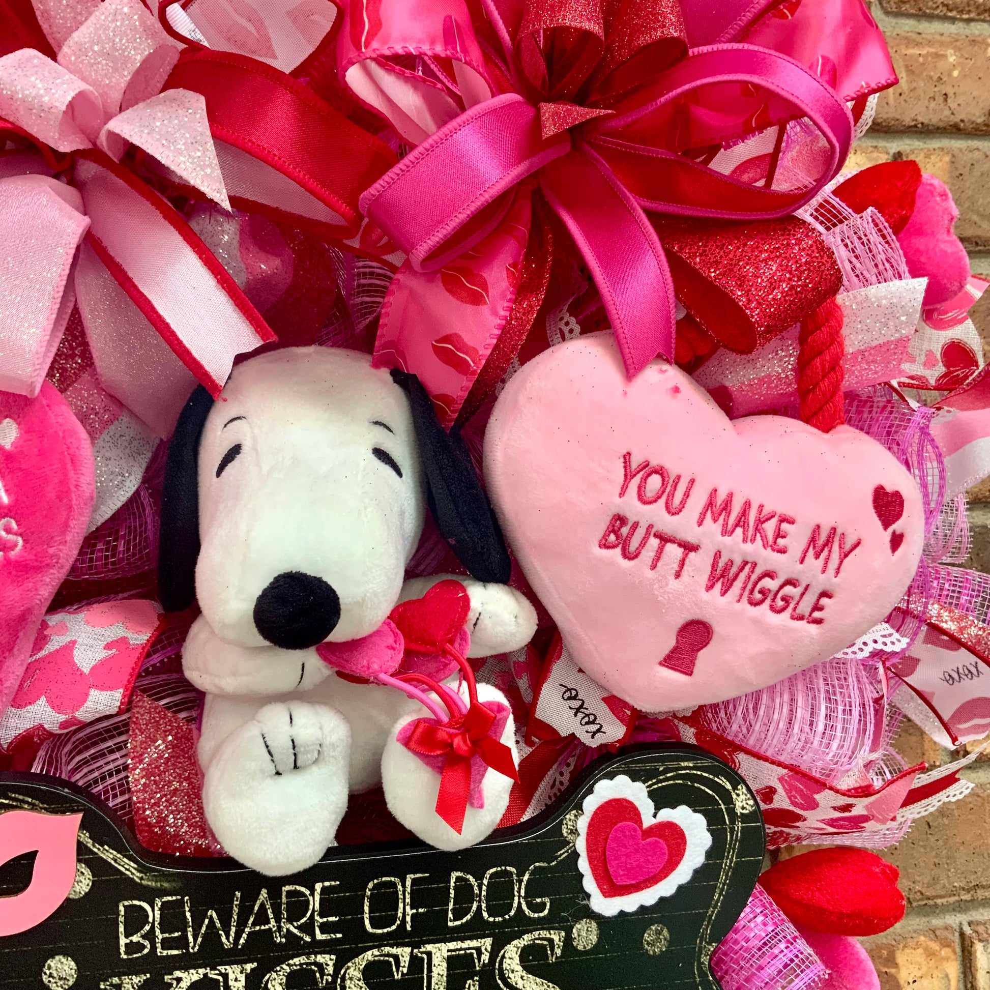 - Materials: Valentine-themed plush Snoopy, two large plush hearts with sayings, wired edge ribbons (hearts, XOXO lips, lace, glittered, velvet), glittered foam lips, pink and red plush embellishments, two handmade bows