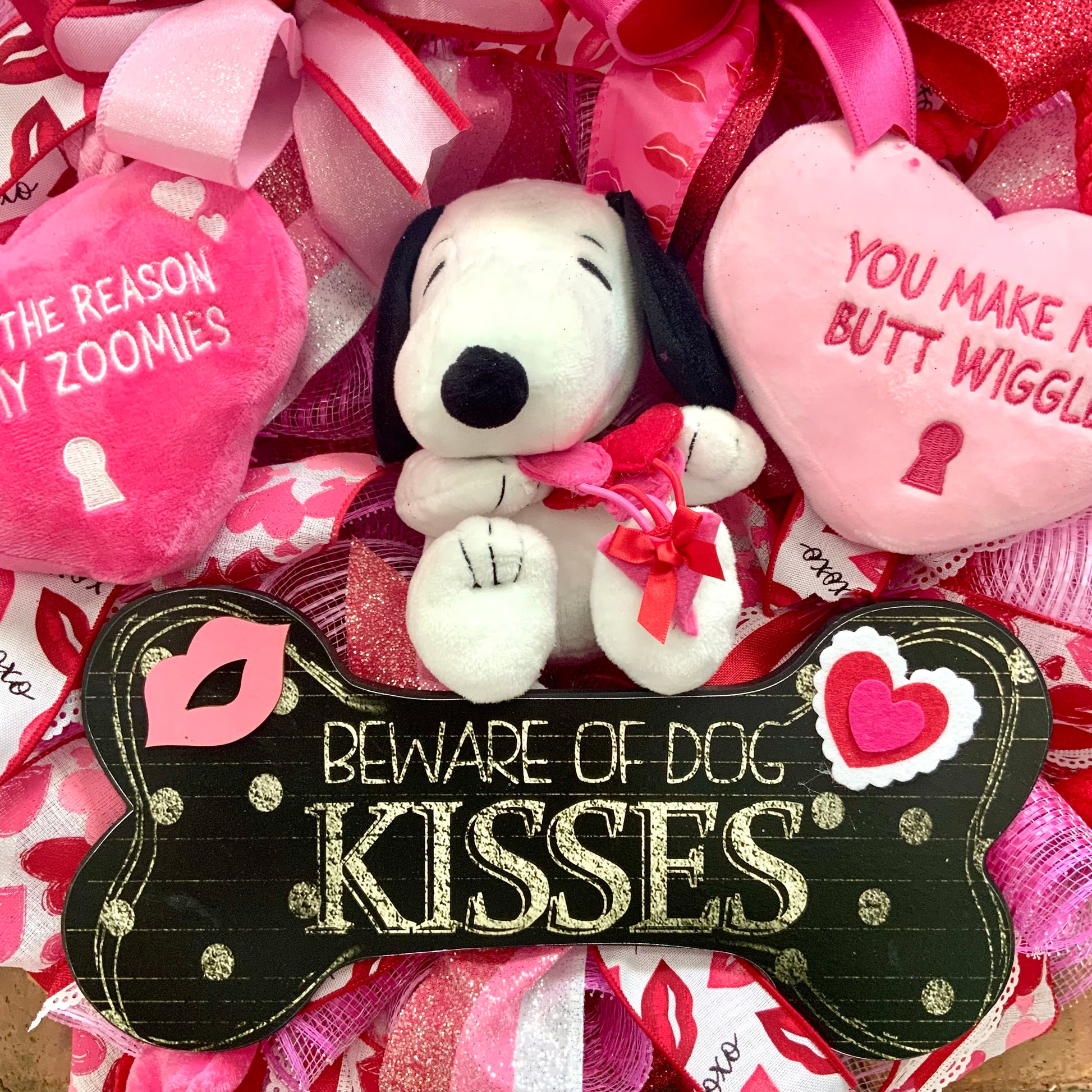 You make my butt wiggle! You're the reason for my zoomies! This hilarious and heartwarming Snoopy Valentine's wreath celebrates the unconditional love and pure joy that dogs bring to our lives. Featuring an adorable Valentine-themed plush Snoopy and two large plush hearts with the funniest dog-lover sayings, this wreath is perfect for anyone who knows that true love means tail wags, butt wiggles, and happy zoomies. With glittered foam lips, romantic ribbons featuring hearts and kisses, and festive pink and red embellishments, this wreath brings puppy love and laughter to your Valentine's Day decor!