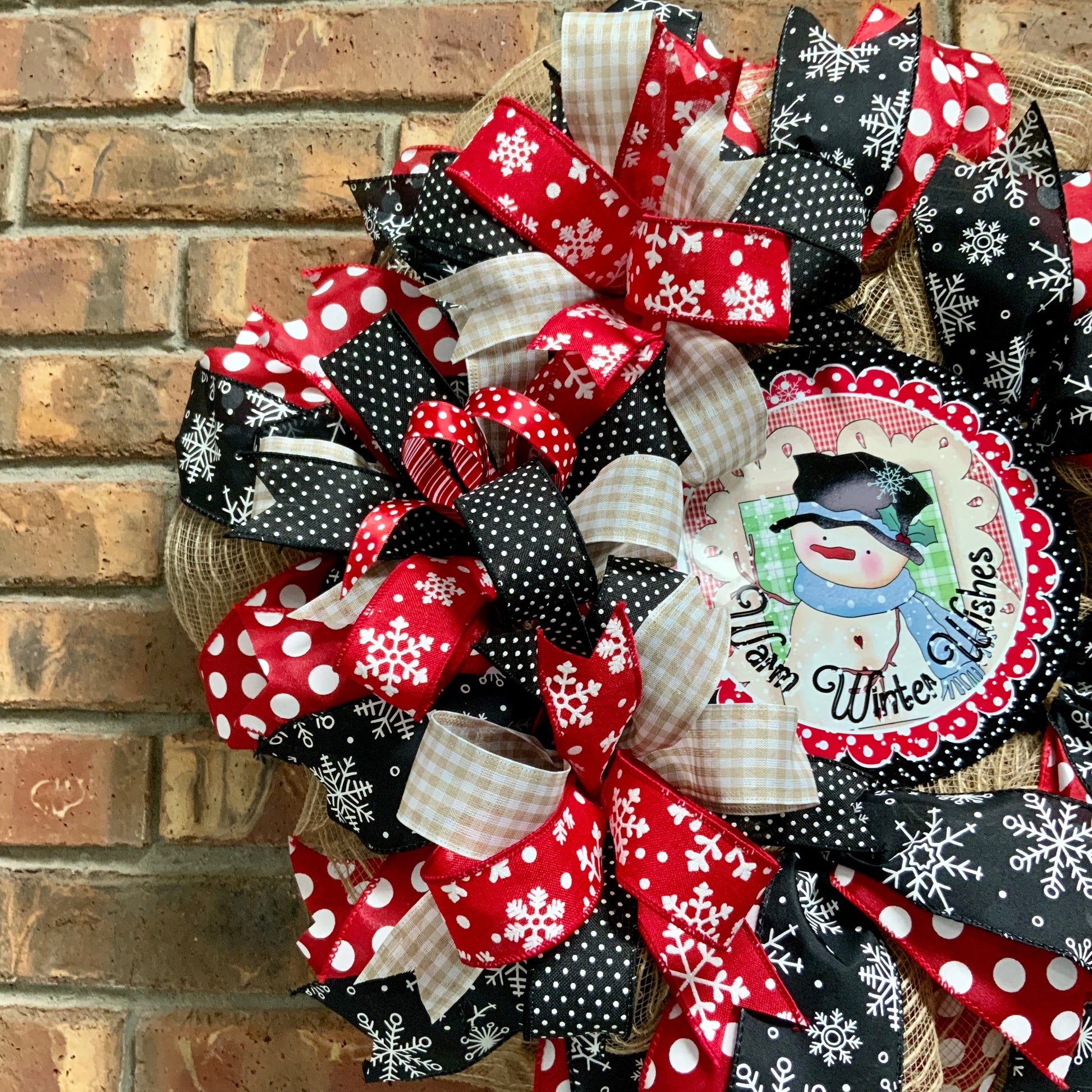 Warm winter wishes is an adorable winter and holiday wreath. This wreath is made in a pancake design to fit perfectly behind a storm or screen door but looks beautiful on any door. With its classic colors and adorable snowman this wreath will be stylish the whole Winter season.