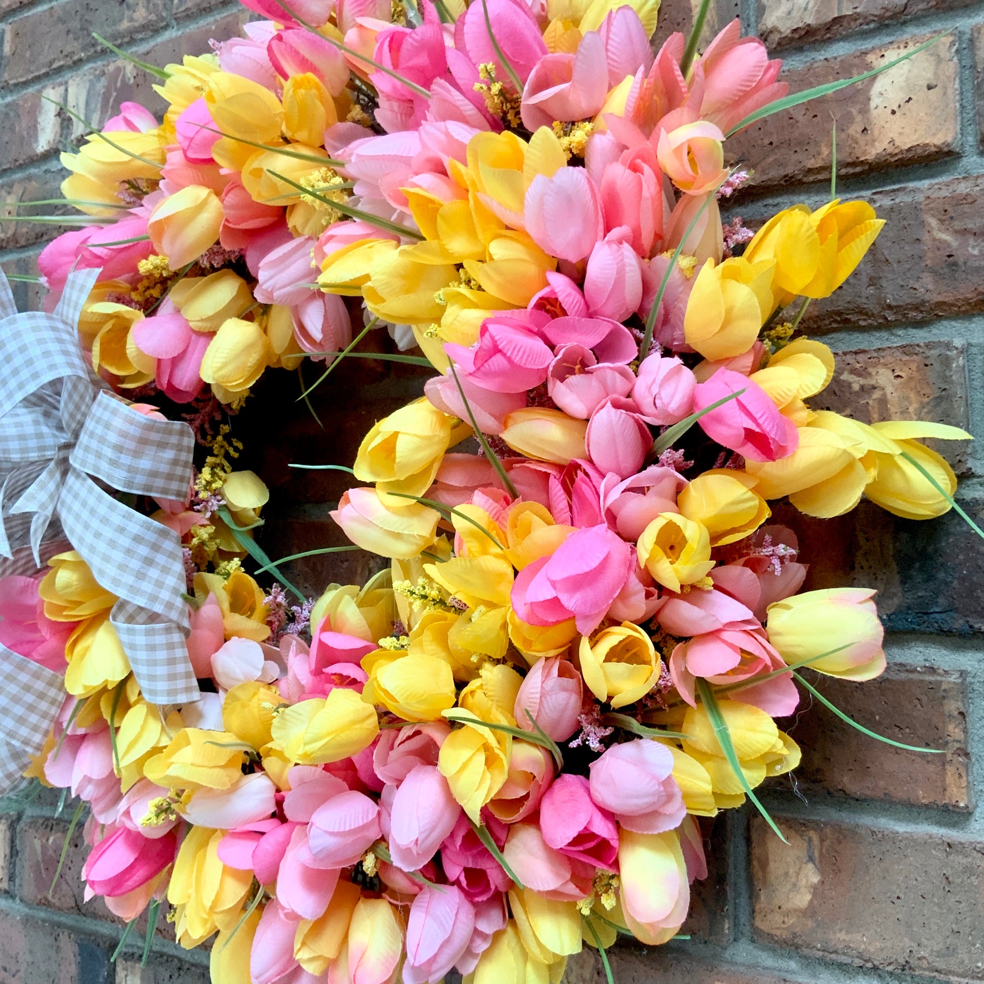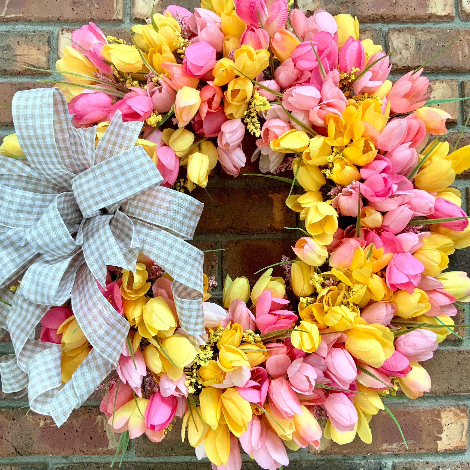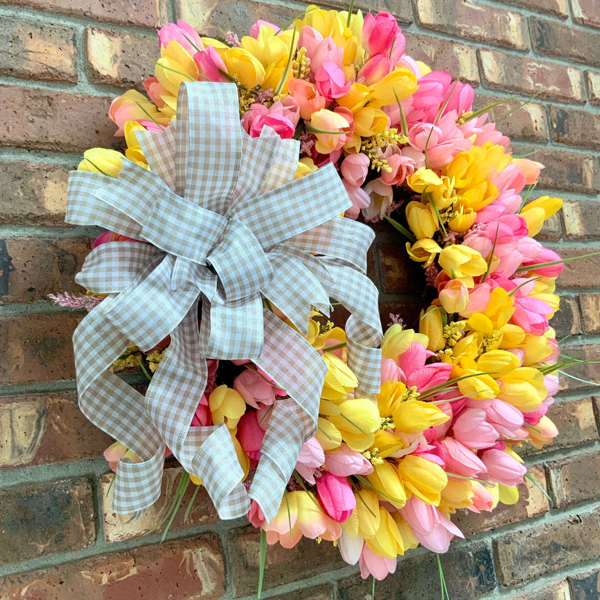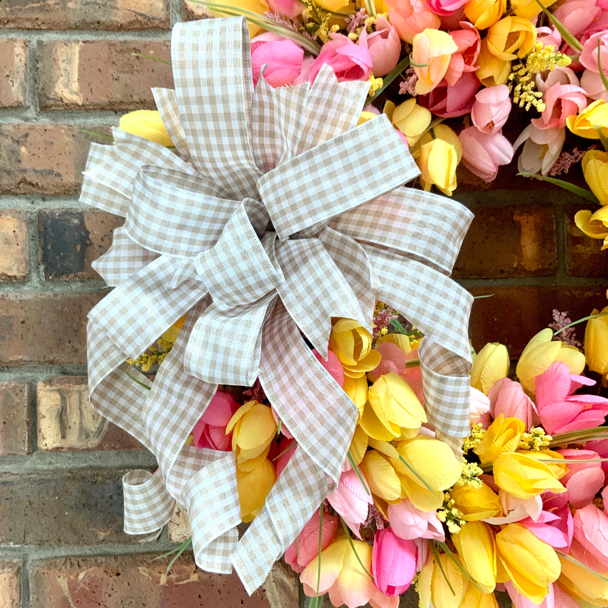 Measuring in at 20 inches in height, 20 inches in width, and 8 inches in depth. This wreath is made on a 14 inch grapevine with multi colored tulips, astilbes, wired edge ribbon and a handmade bow.
