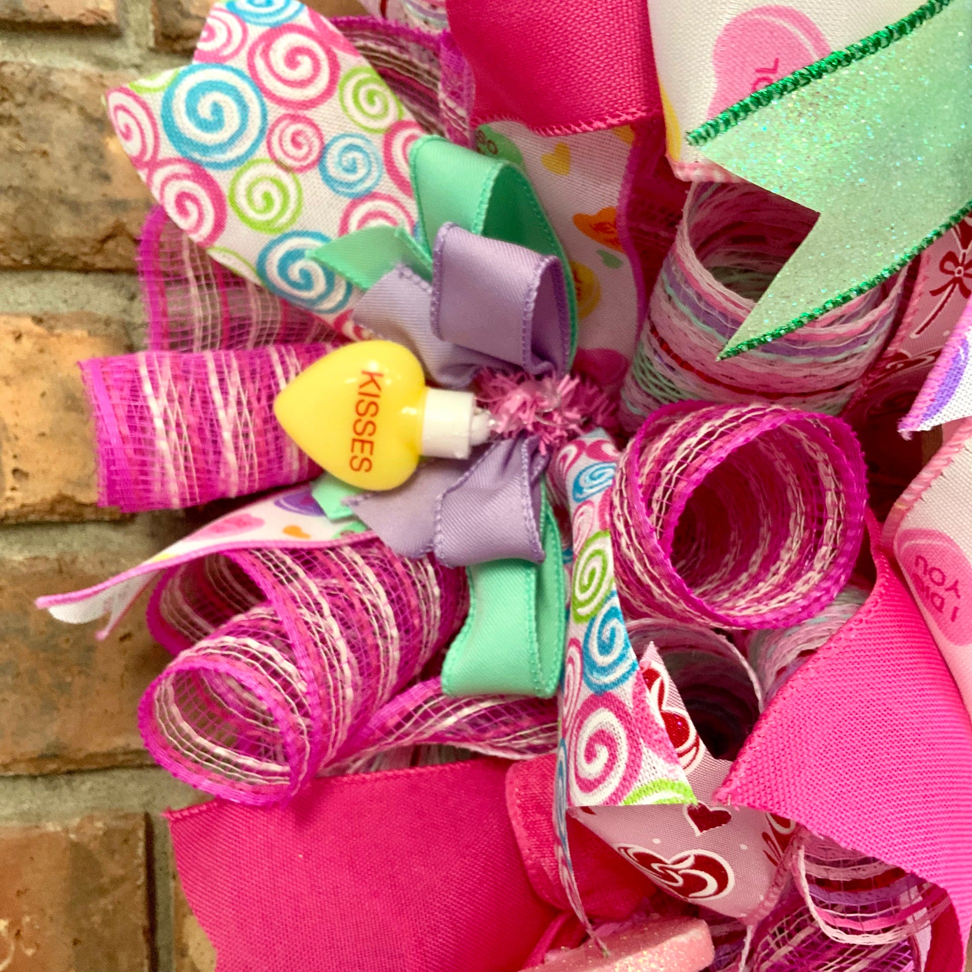 Measuring in at 23 inches in height, 22 inches in width and 9 inches in depth. This wreath is made on a metal wreath frame, with deco mesh, wired edge ribbons, wooden sign, metal hearts, plastic conversation hearts, foam glittered hearts and a handmade bow.