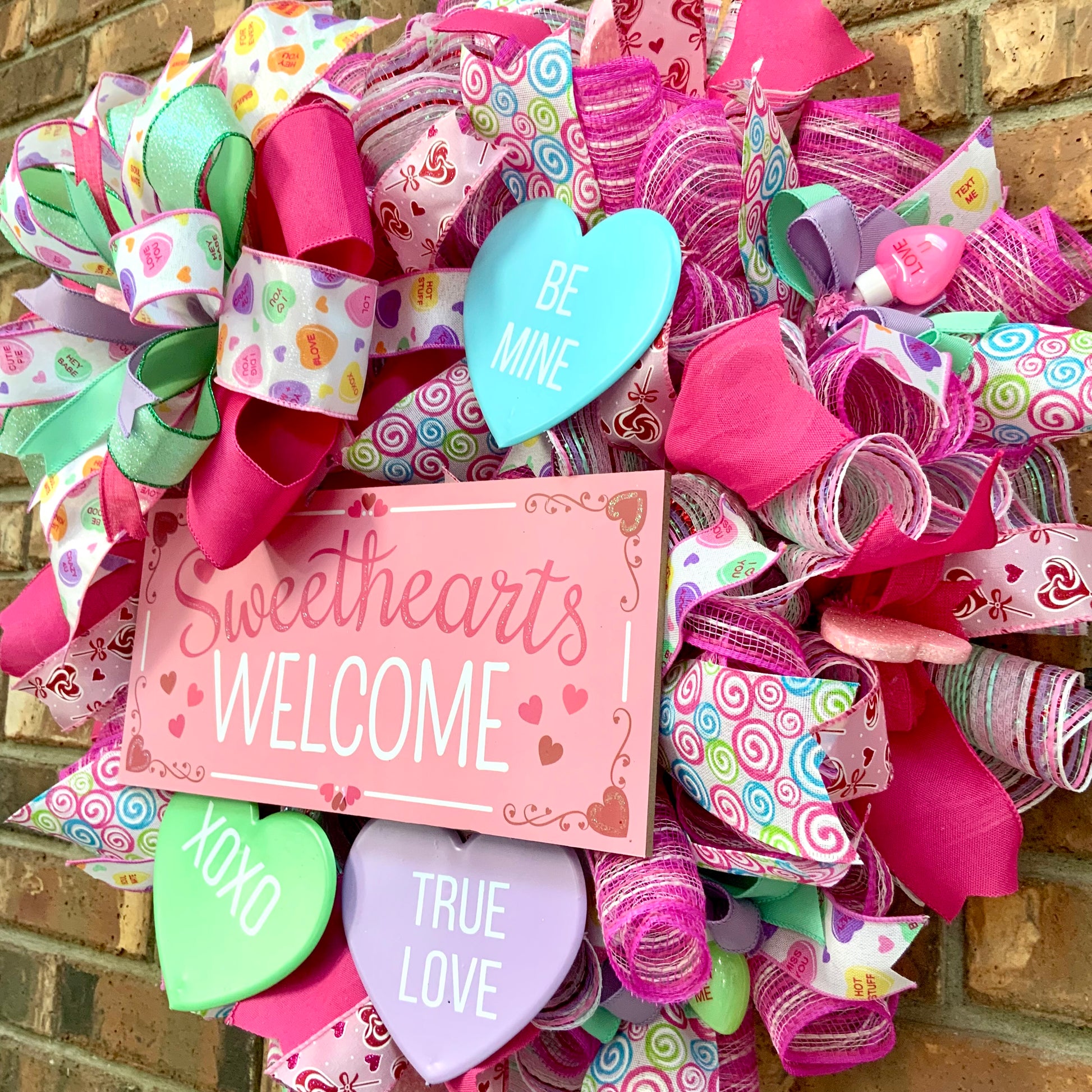 Celebrate the season of love with our Valentines Day Wreath! Adorned with festive conversation hearts and a heartwarming "Sweethearts Welcome" sign, this charming wreath will add a touch of sweetness to any door. Complete with glittered hearts, it's the perfect way to spread love and joy.