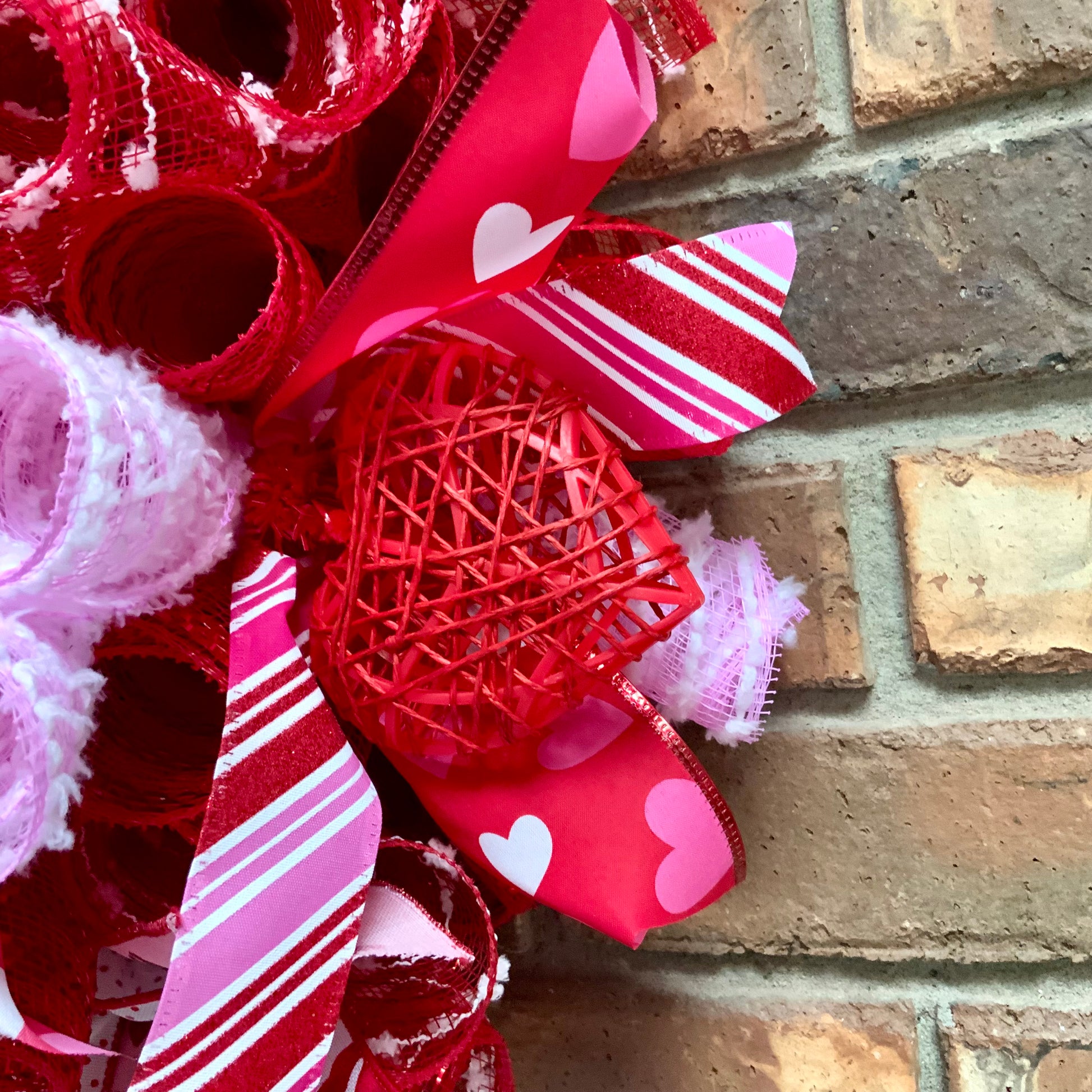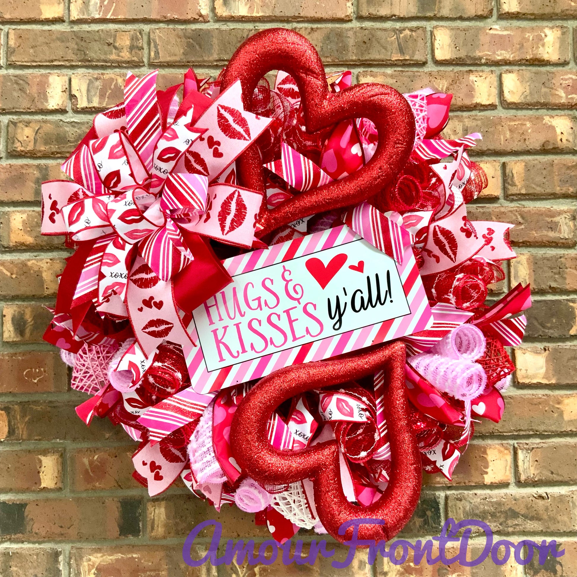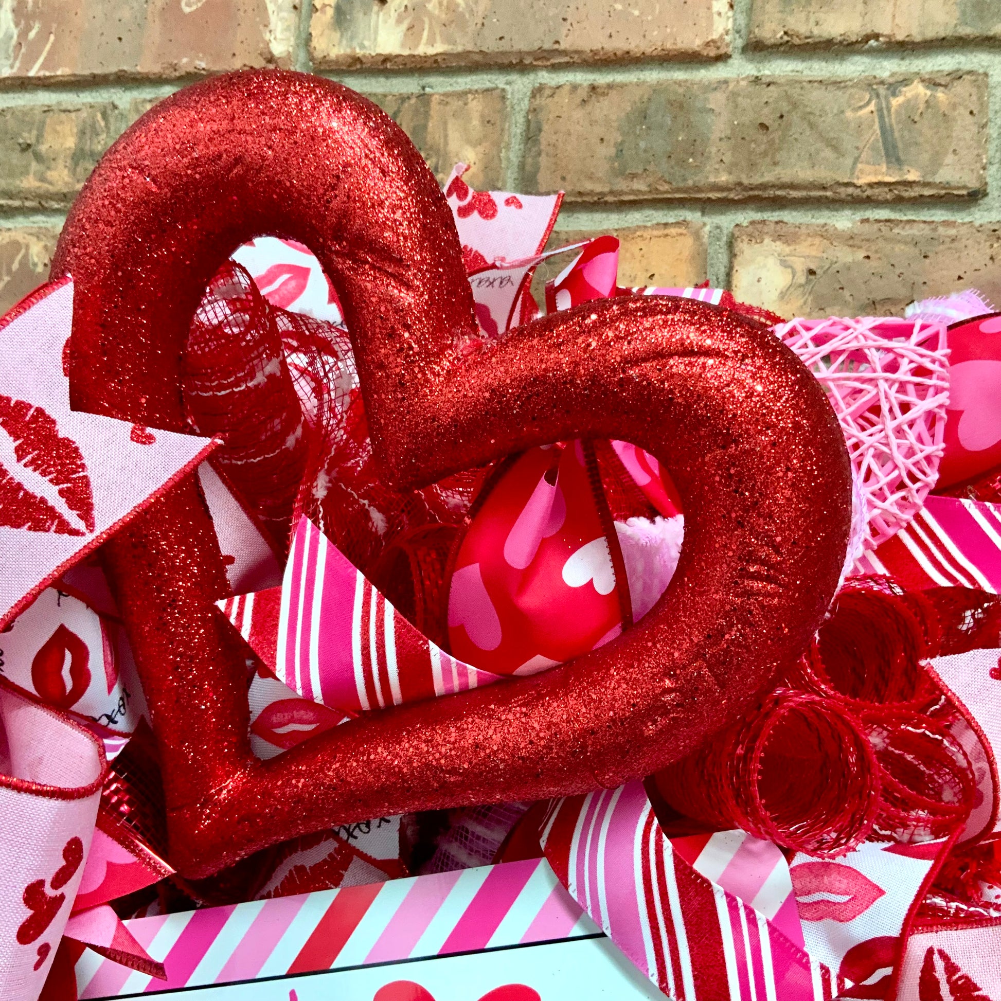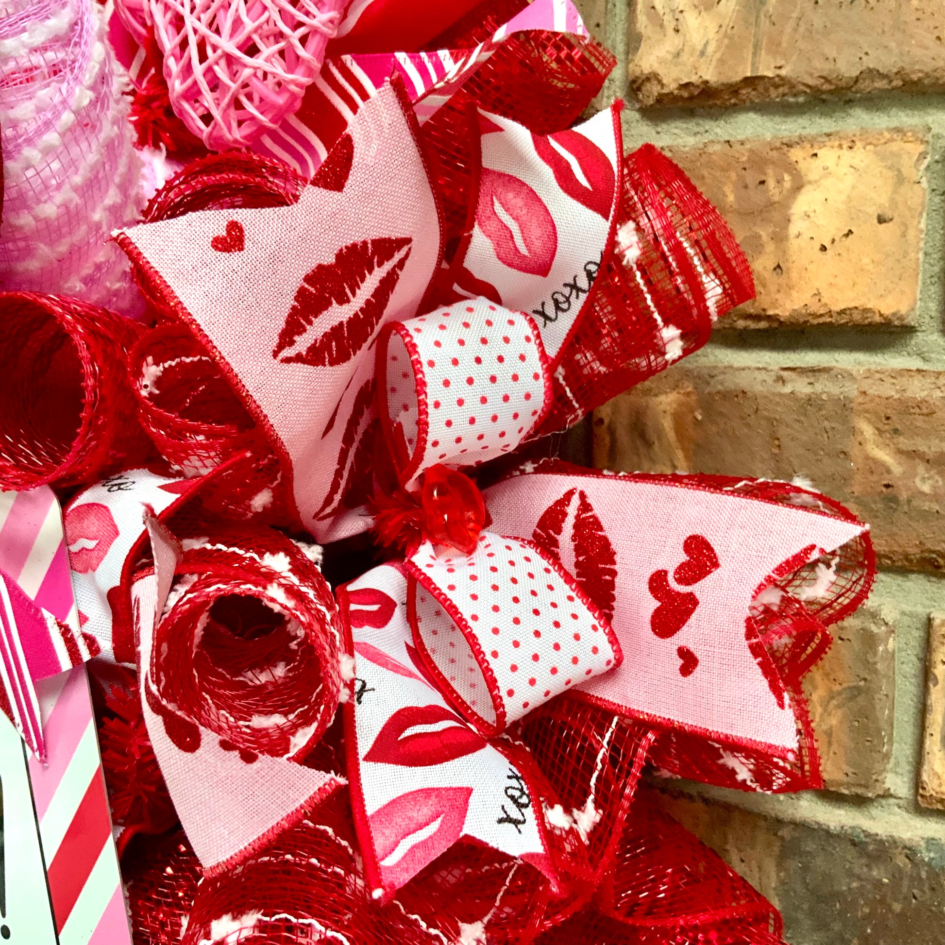 Measuring in at 22 inches in height, 21 inches in width and 10 inches in depth. This wreath is made on a metal wreath frame, with deco mesh, wired edge ribbons, metal sign, yarn hearts, enamel lips, two foam glittered hearts and a handmade bow.