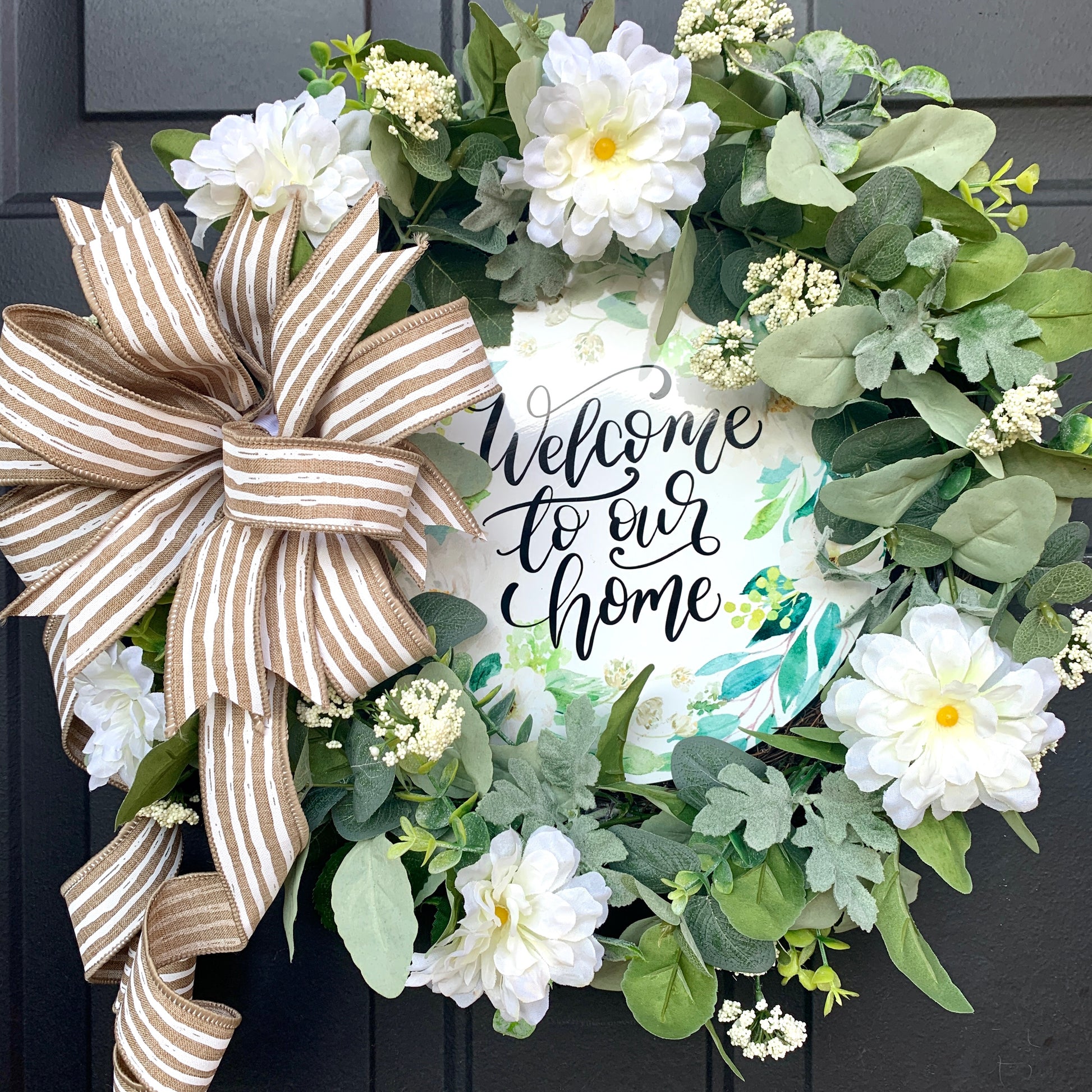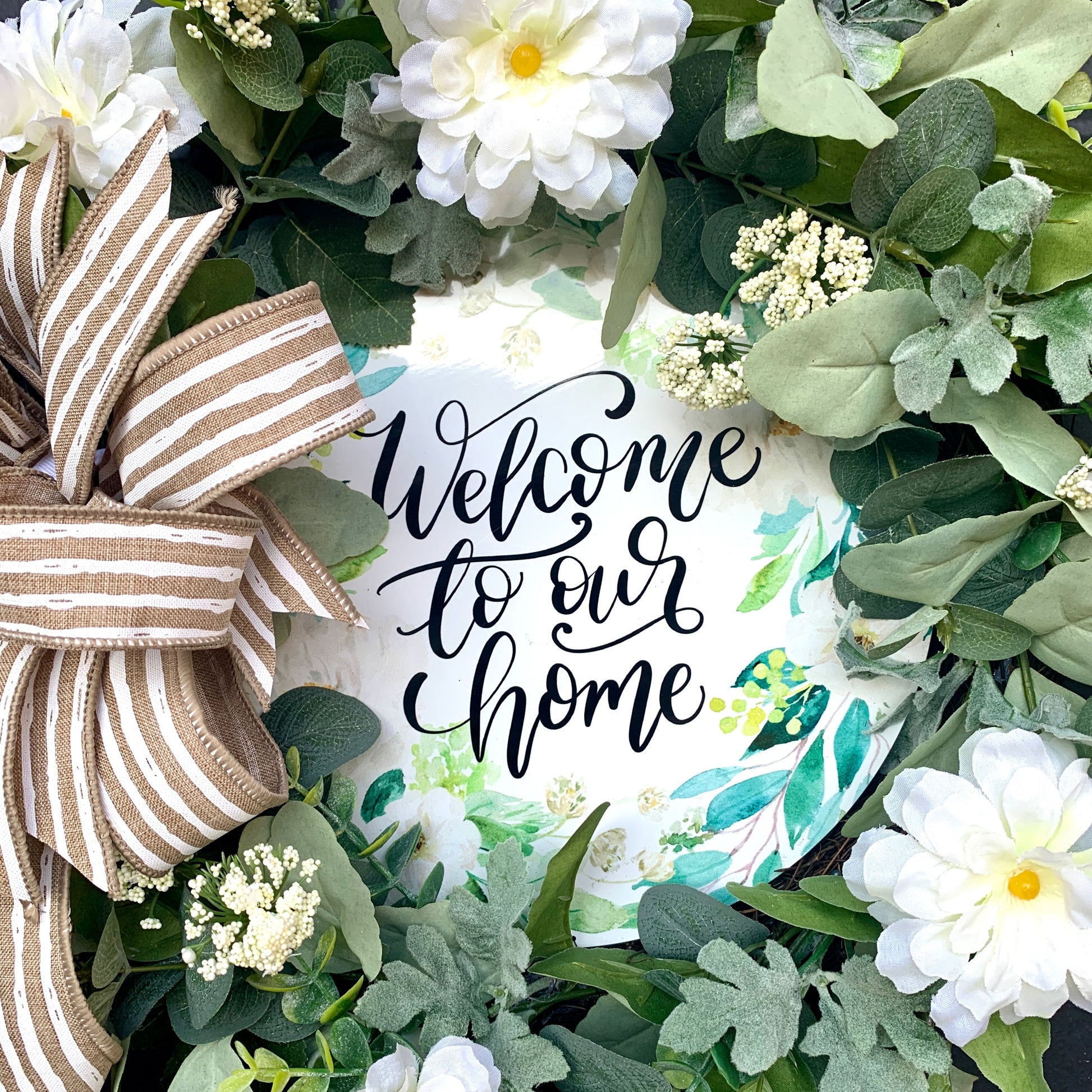 Welcome To Our Home is an elegant everyday wreath that will add a beautiful welcome to your home. This wreath is perfect to fit behind a screen or storm door but will look stunning on any door.
